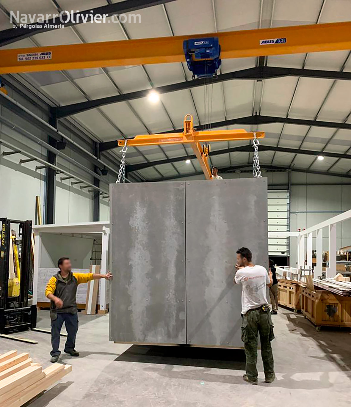 Construcción de cafetería en módulos transportables prefabricados. Construcciín en madera estructural, muros en entramado ligero con aislamiento térmico y acústico.