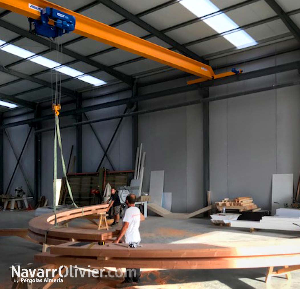 La construcción consta de 2 pórticos de 12 m de luz con una altura de 6,5 m en el interior, las vigas laminadas curvas se fijan entre si mediante uniones mecánicas en estribos ocultos de aluminio con pernios pasantes.