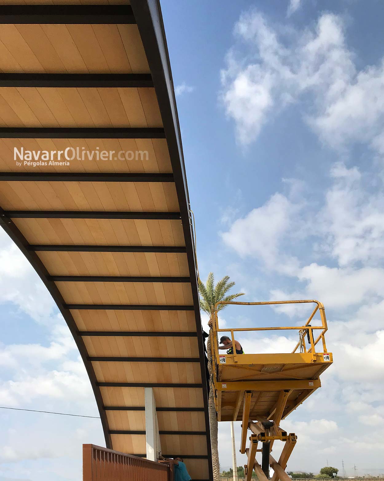 Para el tratamiento de la madera se utilizaron pigmentos naturales y barniz al agua de poro abierto que garantizan la protección y bajo mantenimiento de la instalación. El arco de acceso a la finca agrícola J. Cano se encuentra en Vera, Almería