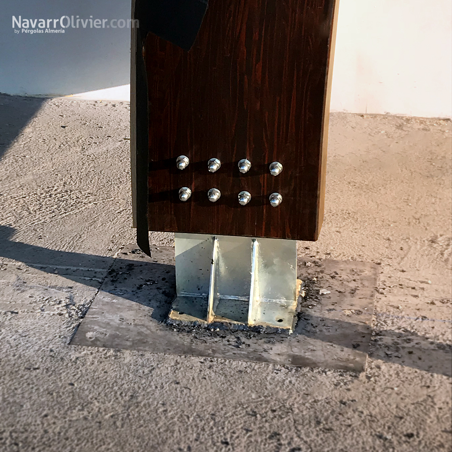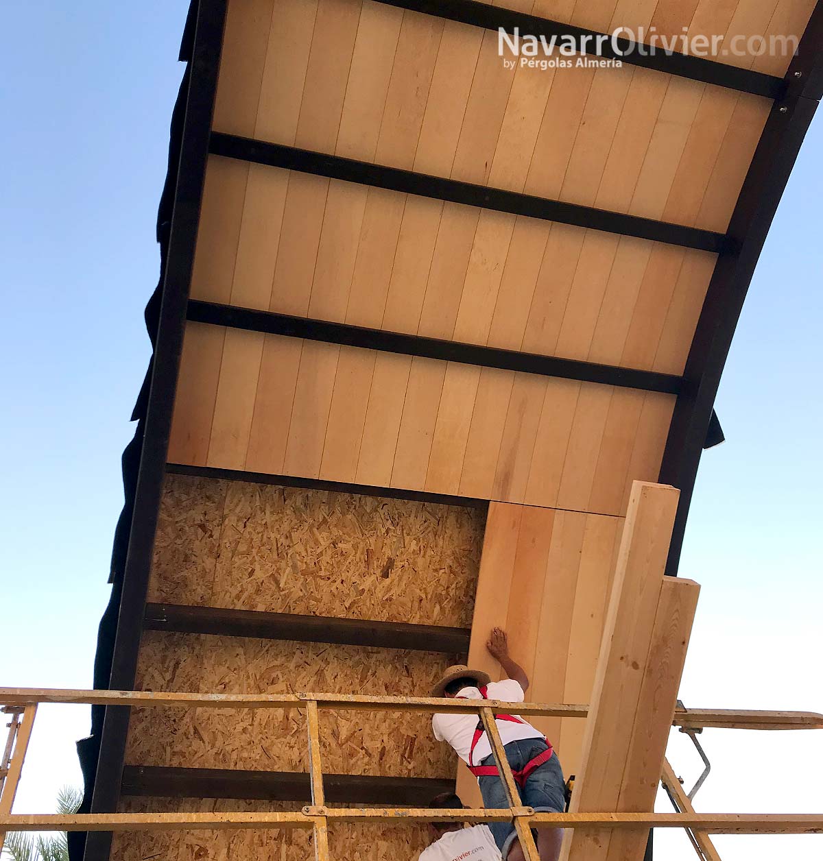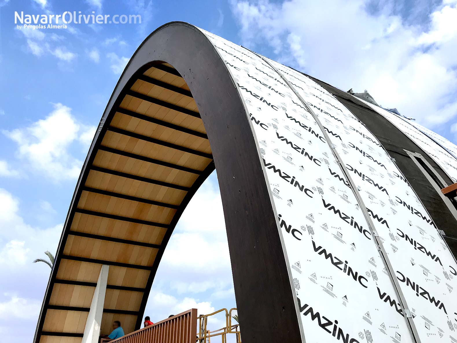 El arco esta fijado a las zapatas de cimentación con anclajes de acero galvanizado soldado, la cubierta exterior se realizó en tablero estructural OSB, impermeabilizado con tela tyvek y rematado en chapa de zinc, para recubrimiento interior se utilizó tablero fenólico de abedul mecanizado.