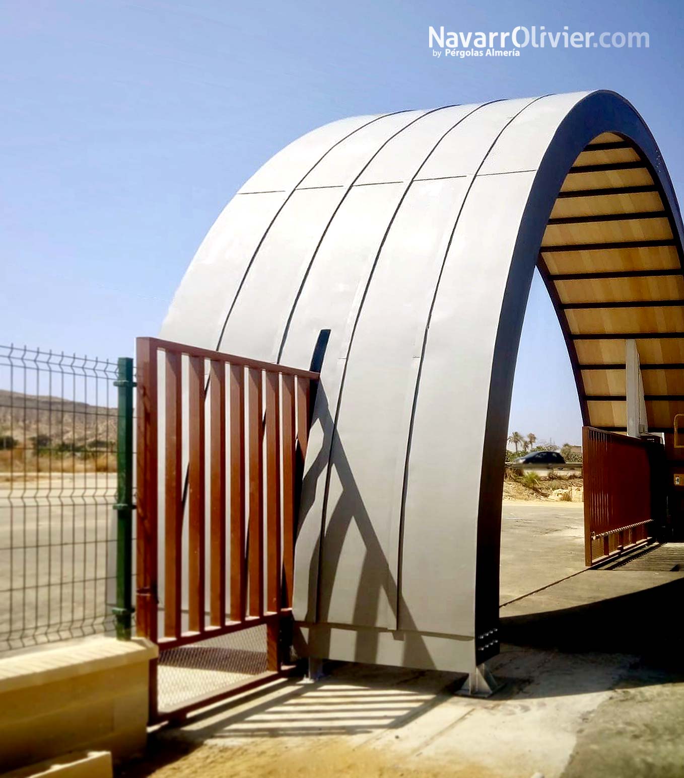 Estructura de madera laminada en abeto Douglas de sección longitudinal curva formando un arco de acceso a la propiedad.