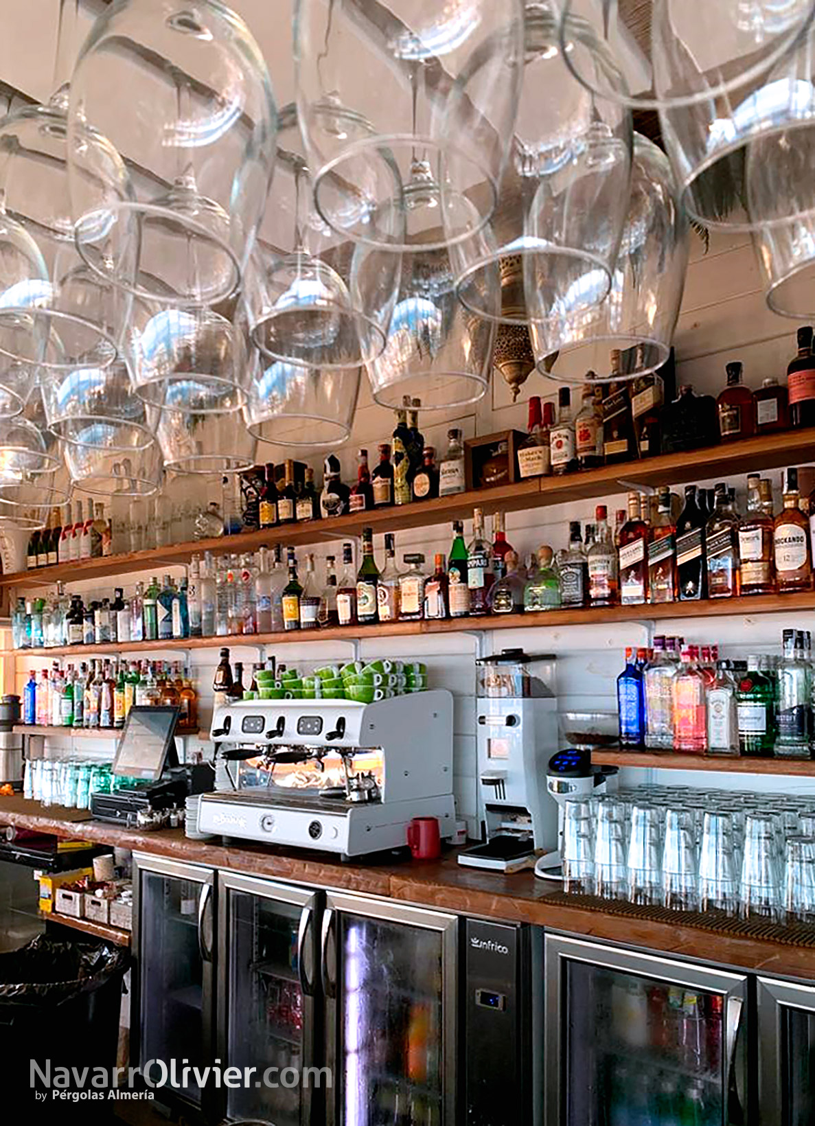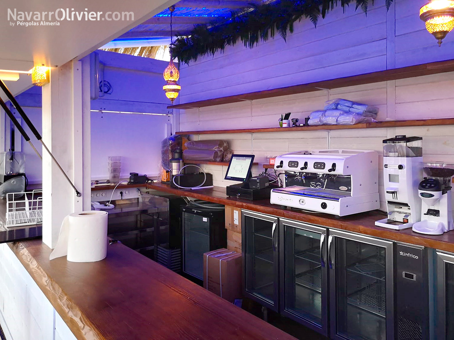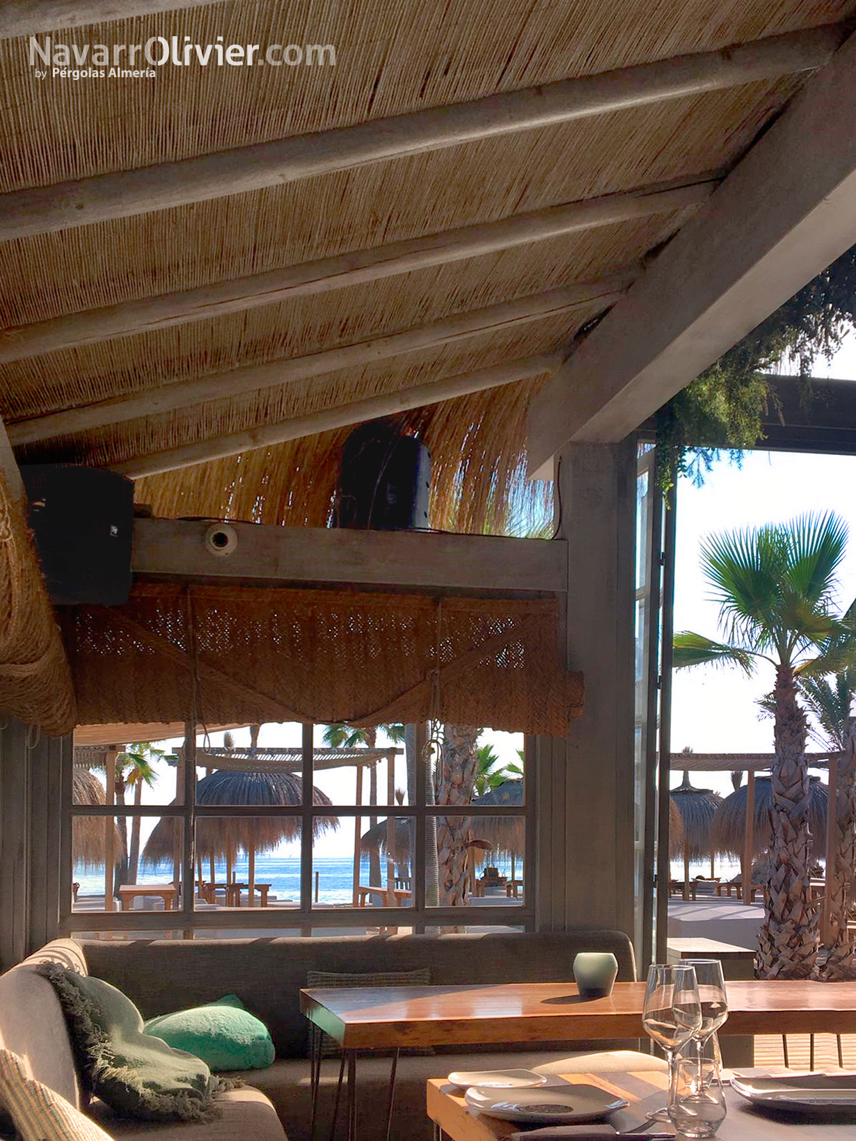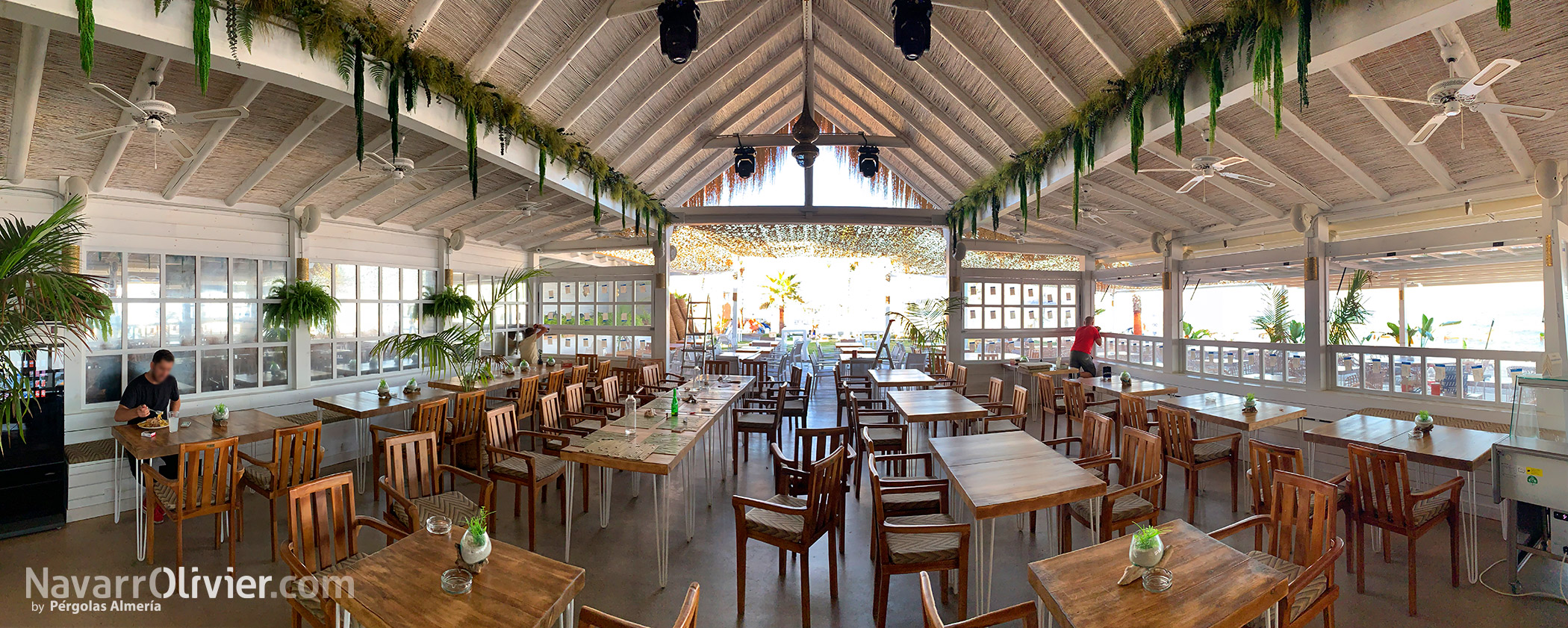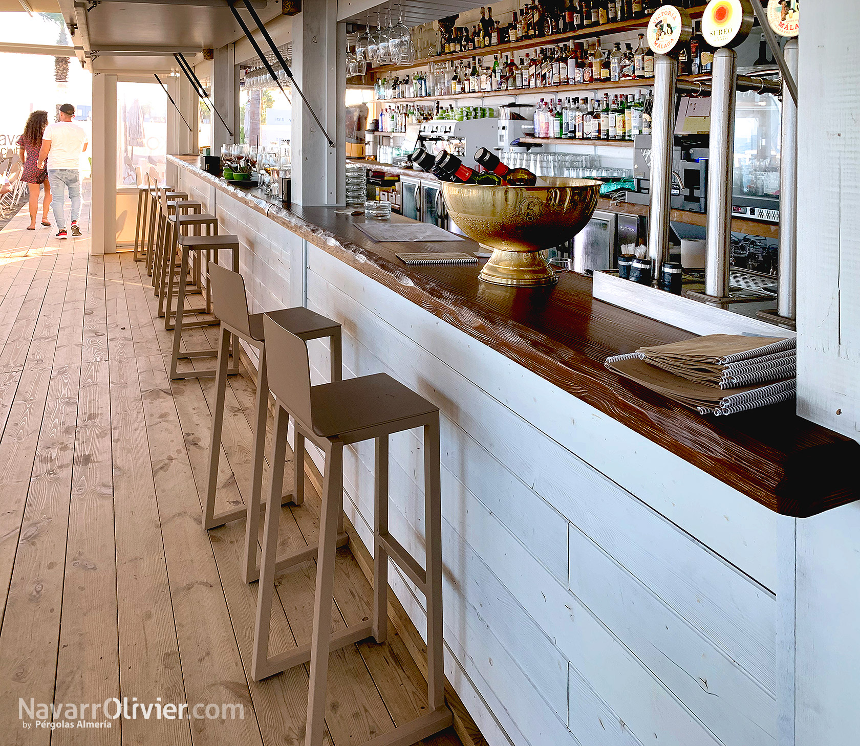El chiringuito cuenta con grandes portalones de madera con cristal repartido abatibles con pistones de gas para facilitar su apertura y cierre permitiendo además que la luz natural bañe el interior de la zona de restaurante.