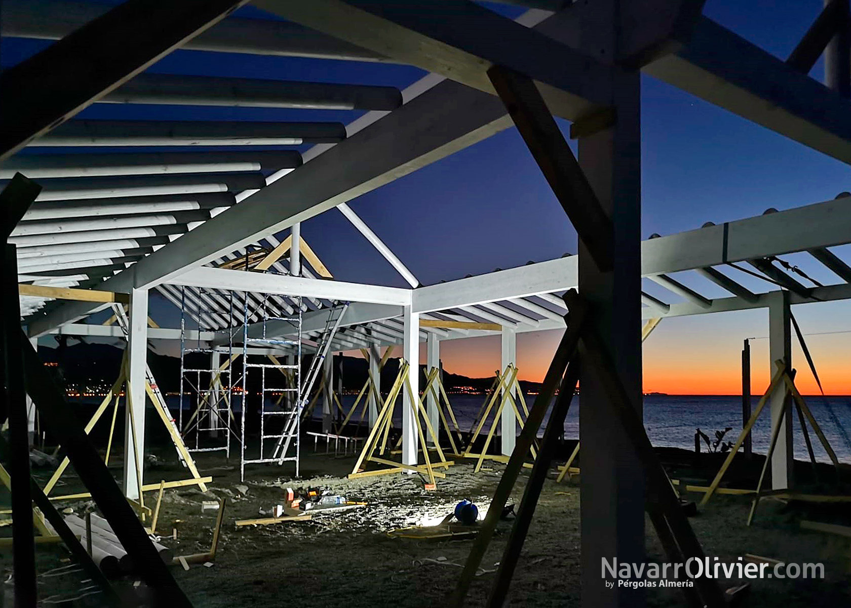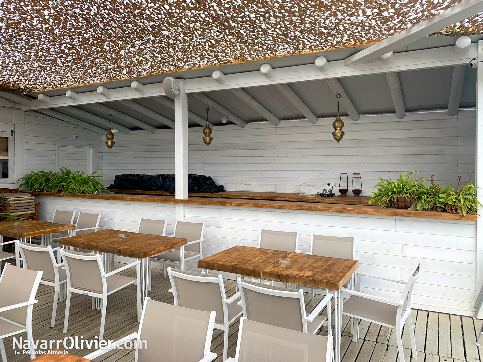 Berebere Oasis de Mar cuenta además con un terraza chillout con suelo en tarima autoclave, zona de terraza con pérgola con cubierta en toldos de palilleria deslizantes y zona de sombraje con red de camuflaje en color beige.
