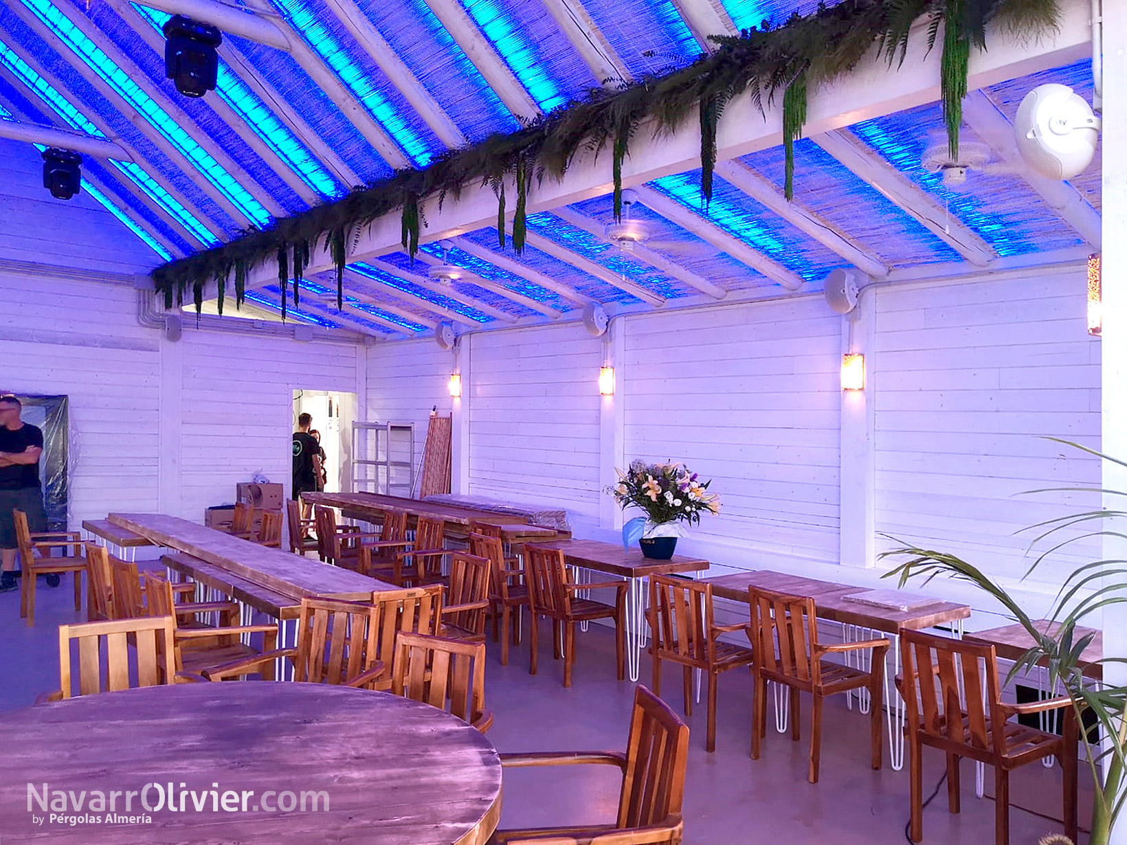 Los muros interiores del restaurante están construidos con un entramado de madera autoclave recubierto en ambas caras por madera aserrada dejando en su interior un vacío técnico que permite la ocultación de las instalaciones eléctricas y sanitarias.