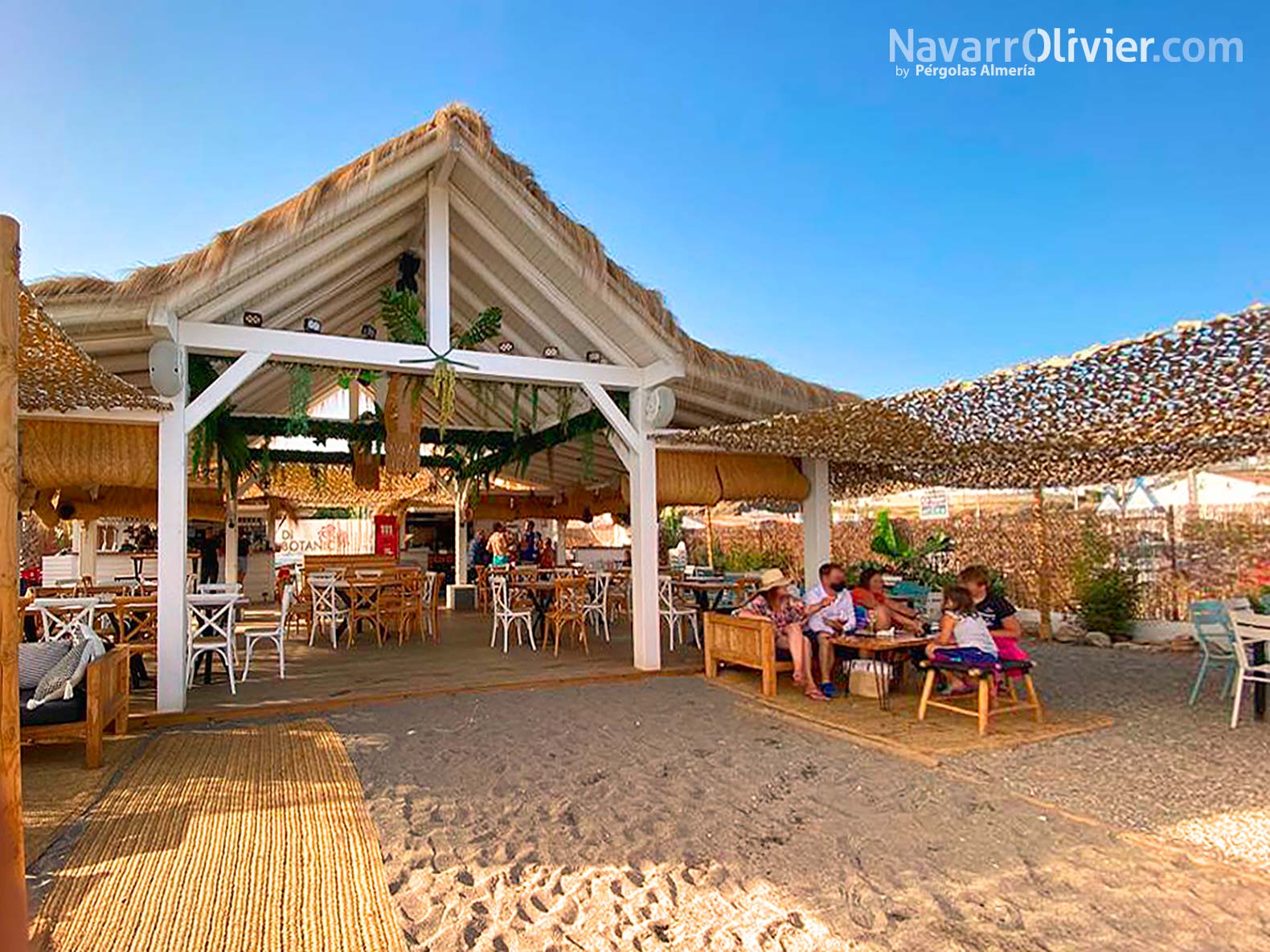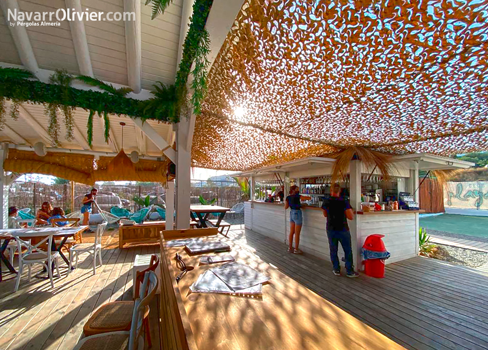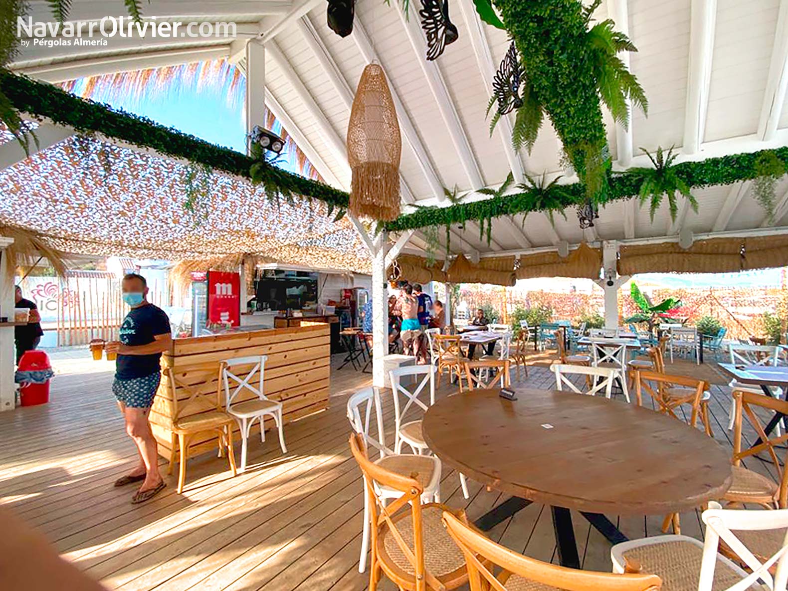 La pérgola sirve como zona de bar y comedor y cuenta con un suelo de tarima en madera autoclave ranurada que se extiende hasta la zona de barra, aseos y acceso al área de sombrillas.