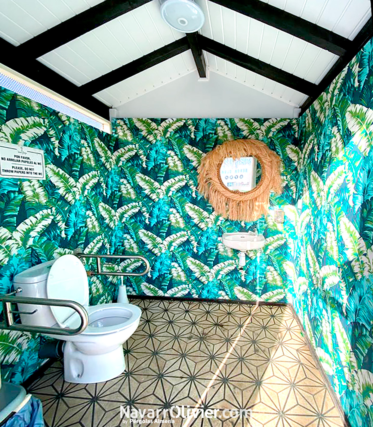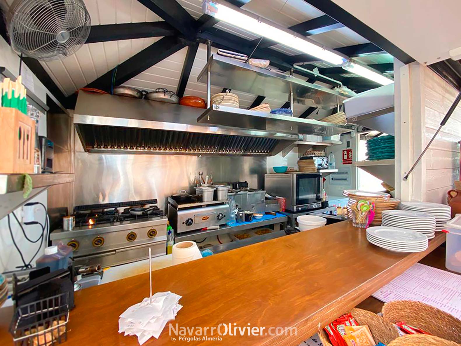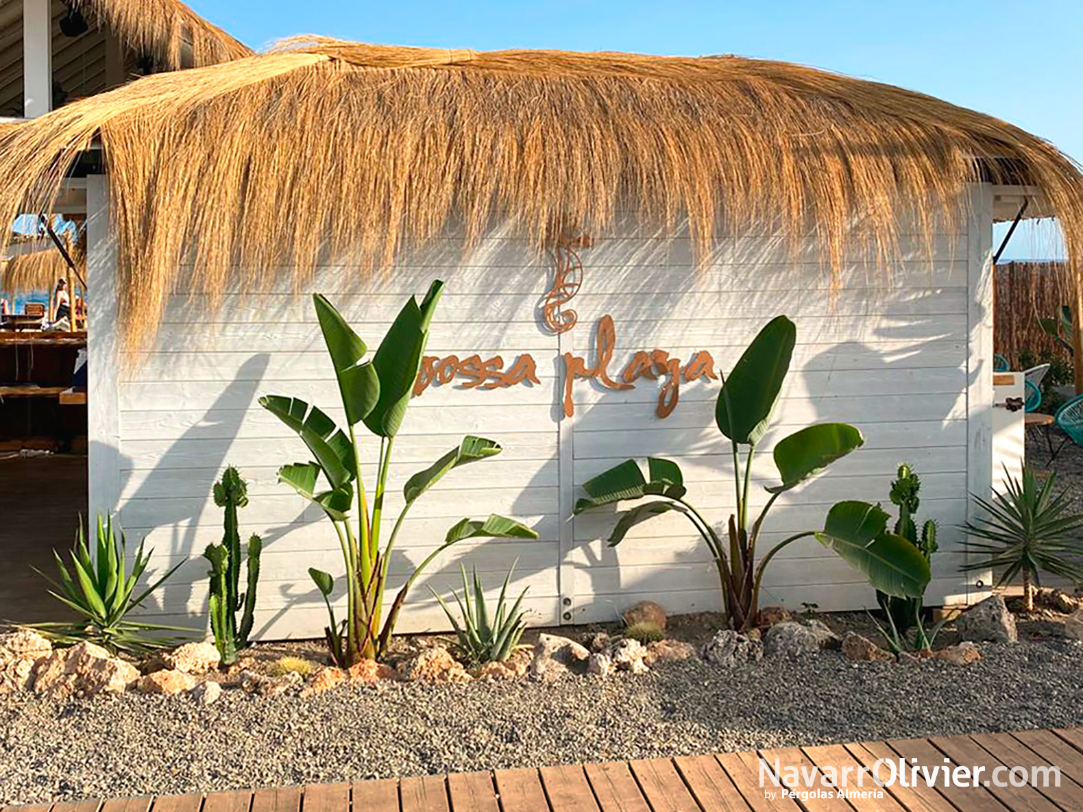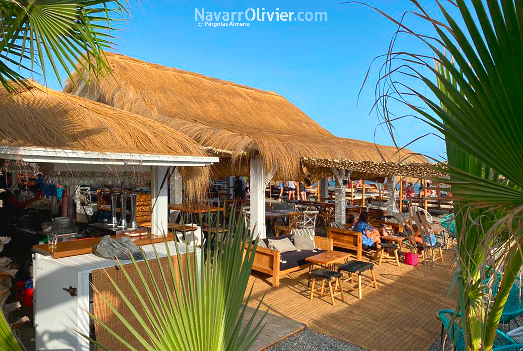 La pérgola sirve como zona de bar y comedor y cuenta con un suelo de tarima en madera autoclave ranurada que se extiende hasta la zona de barra, aseos y acceso al área de sombrillas.