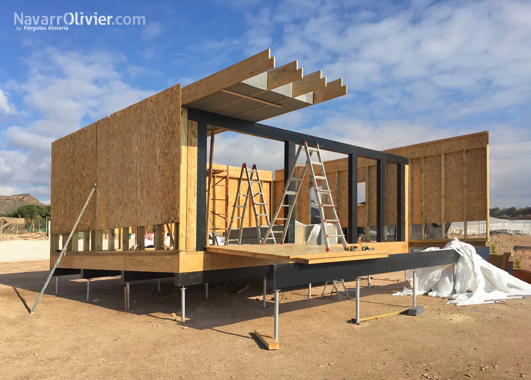 Construcción de vivienda eficiente de 60 m² sobre pilotes metálicos con terraza elevada que incluye una piscina ideal para disfrutar de los cálidos atardeceres de la localidad murciana de Mazarrón.