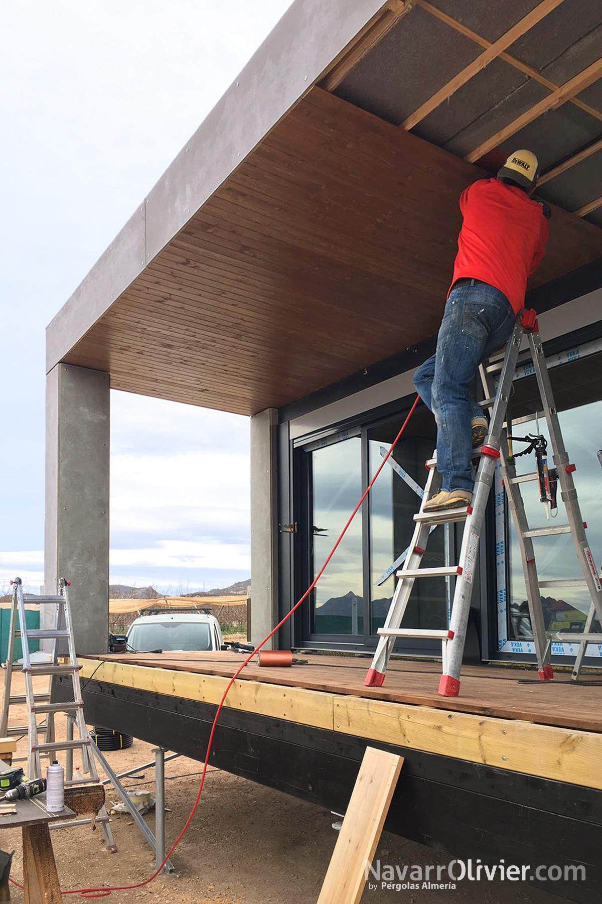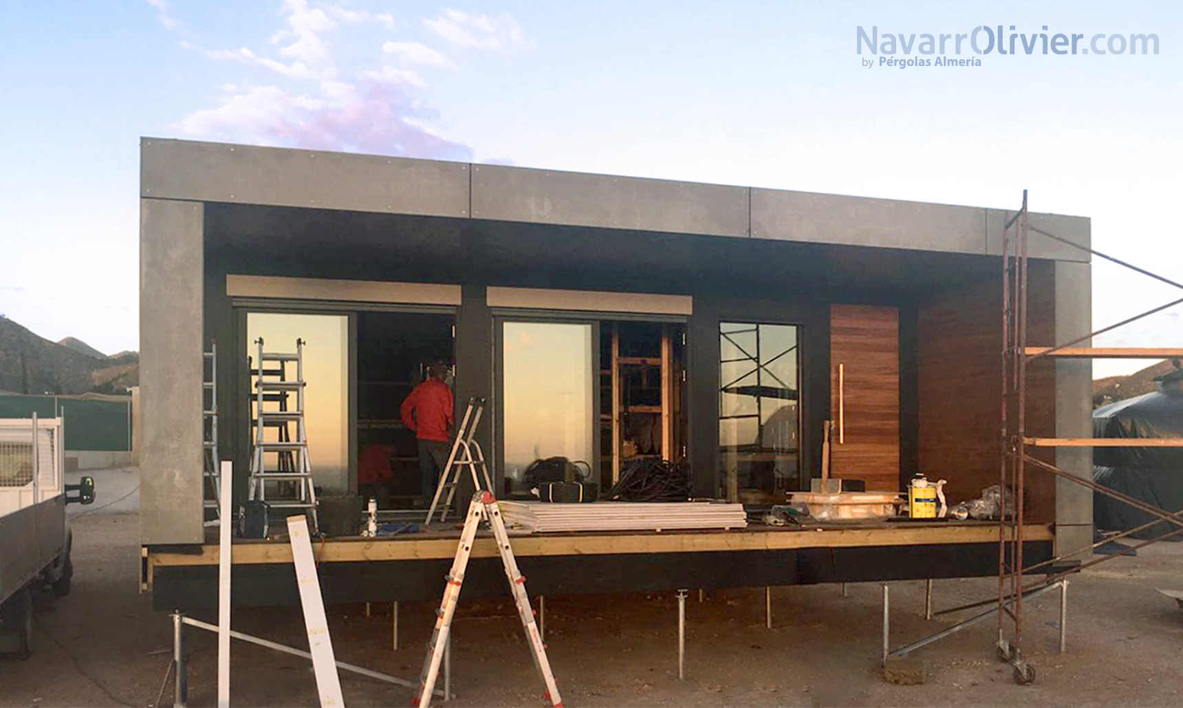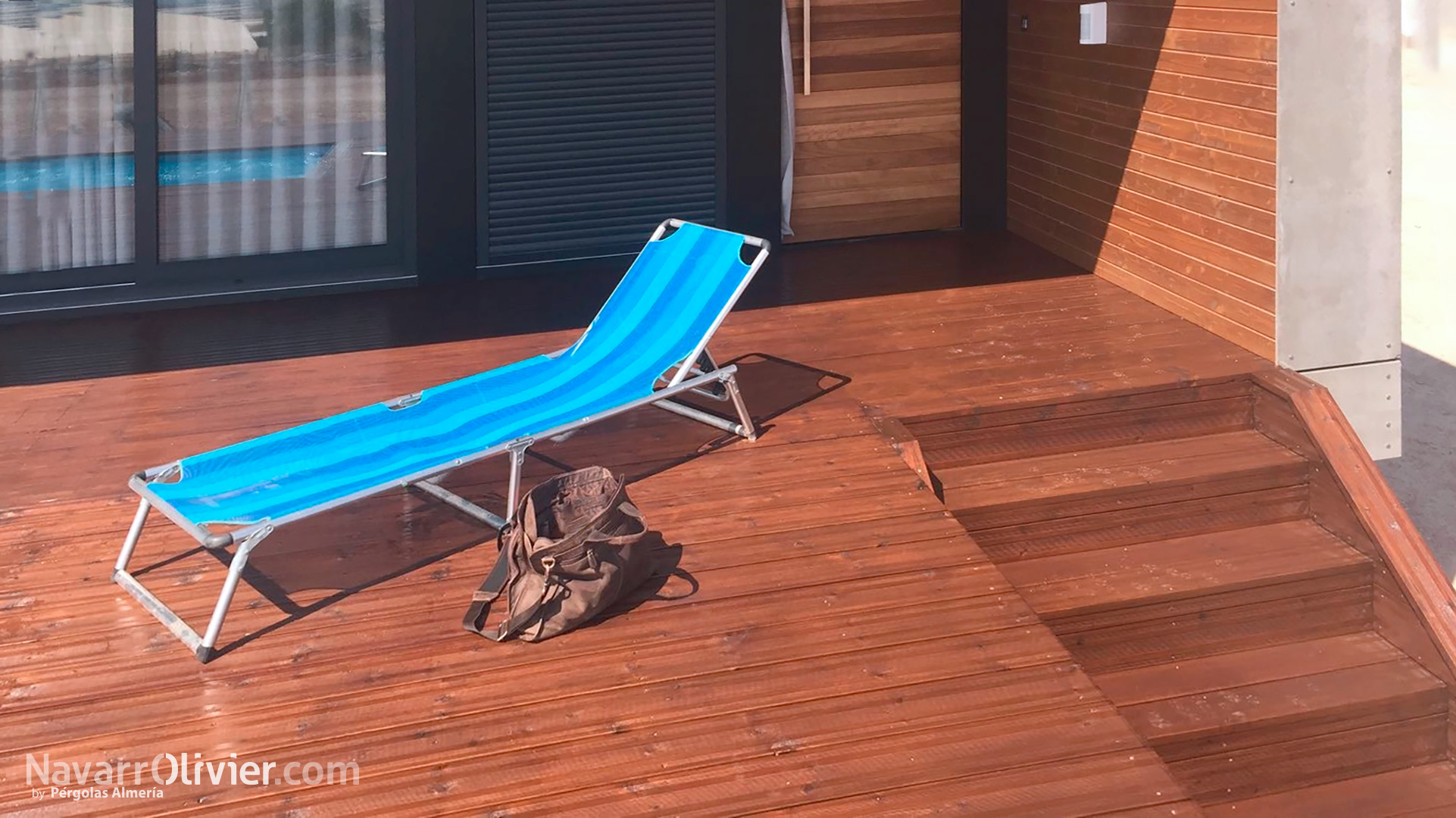 El acceso a la vivienda cuenta con una escalera que al igual que la superficie de la terraza el porche están construidos en tarima autoclave.