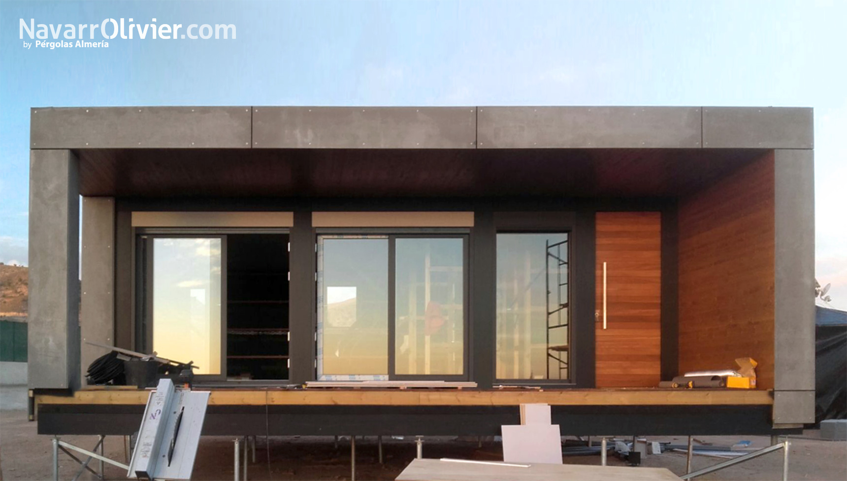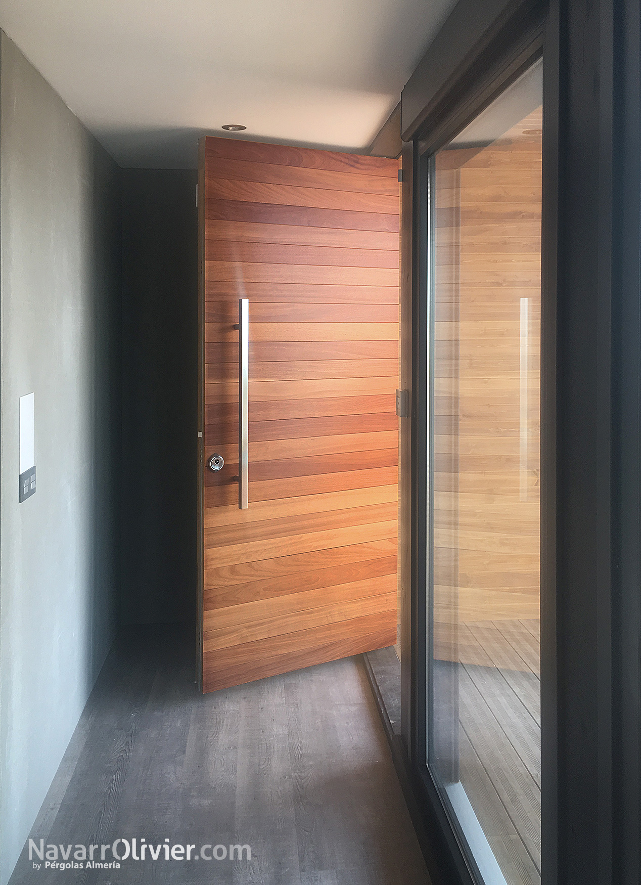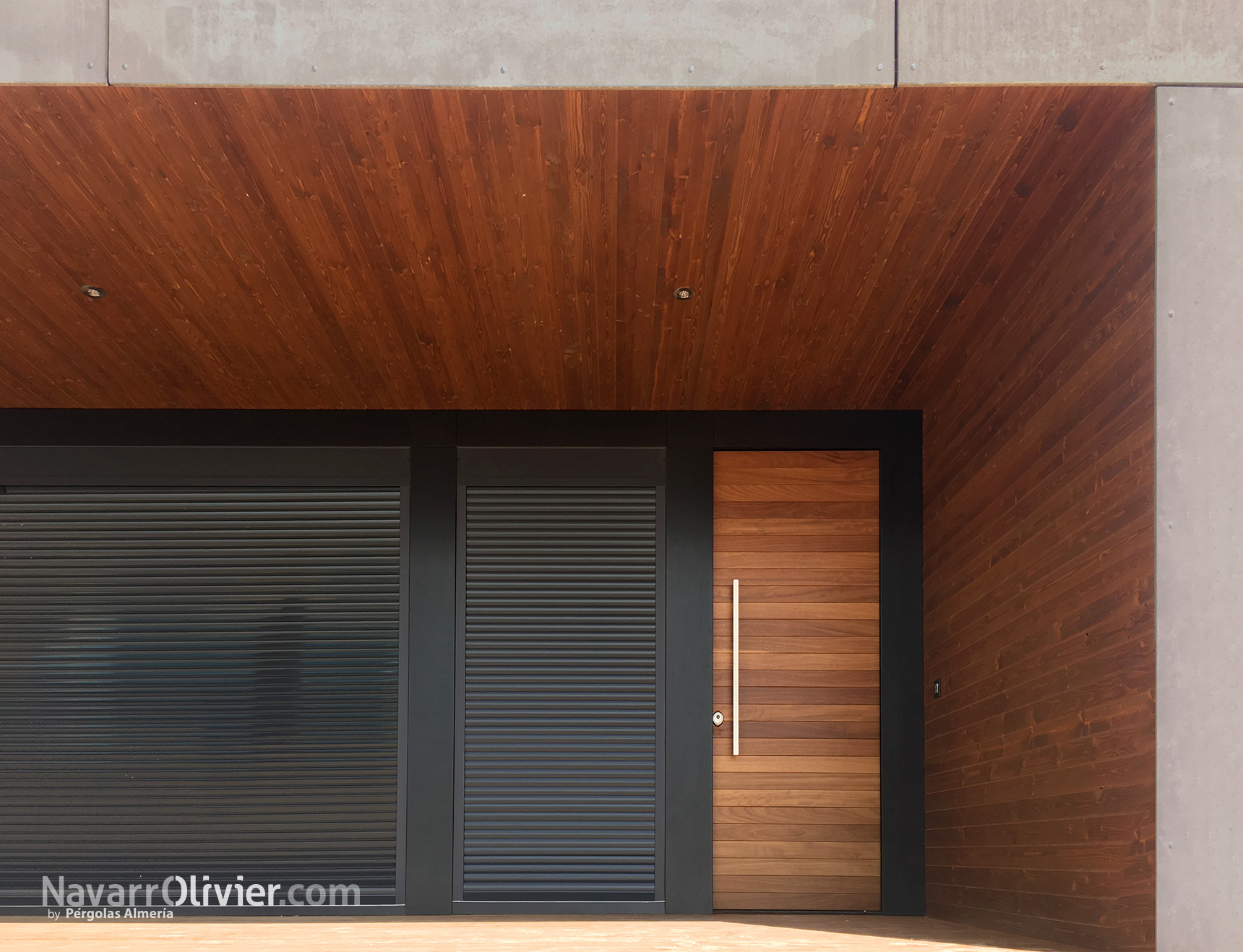 La casa cuenta con un amplio porche que protege de la luz solar directa sobre la cristalera principal y la puerta de acceso fabricada en madera de iroko.