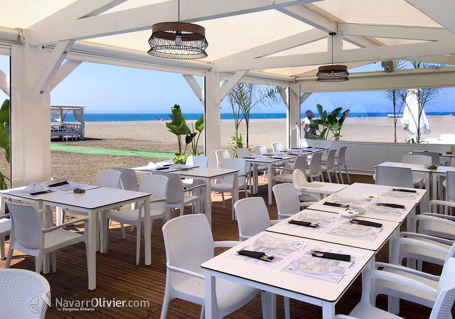 Terraza con pérgola desmontable para sombraje en madera para exterior acabado en blanco neutro, suelo en tarima autoclave clase IV con ranurado antideslizante acabado en marrón (tanatone), cubierta en pvc ignífugo y toldos corta viento enrollables con zona transparente sobre guías de aluminio.