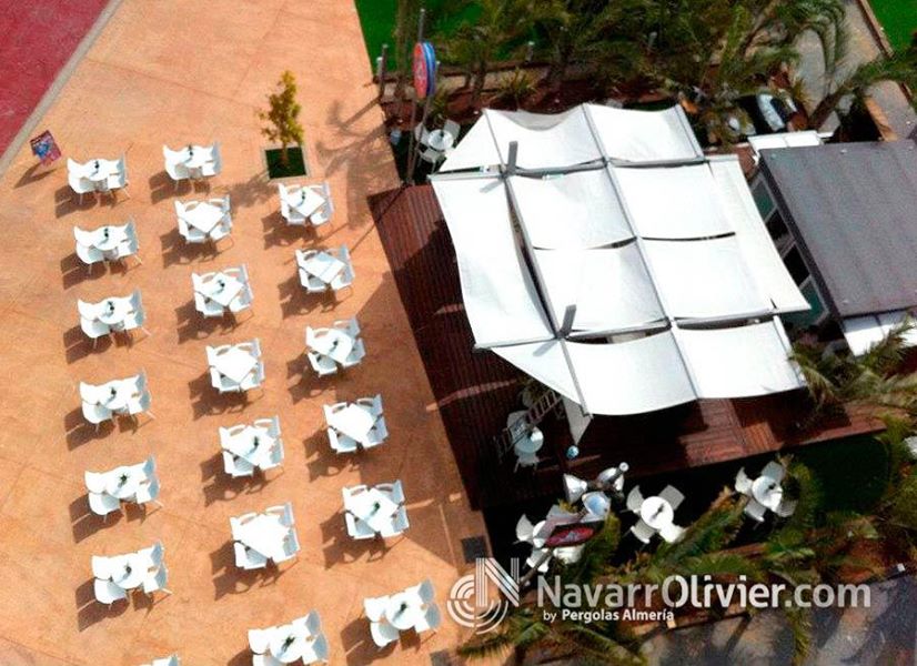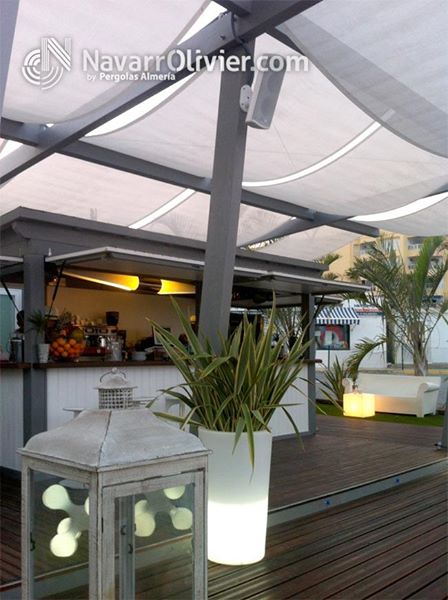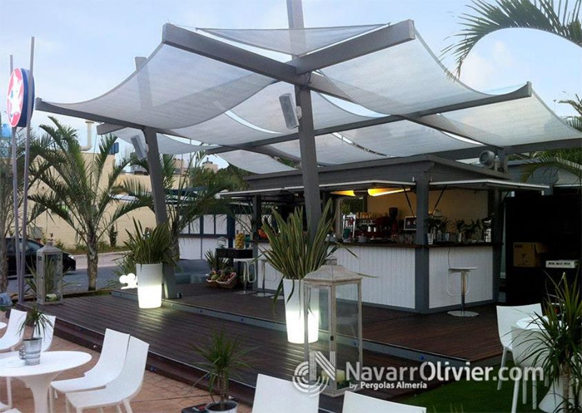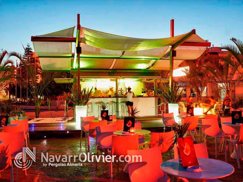 El montaje consta de un chiringuito de 10 m2 modelo Campello con pérgola extraplamada y cubierta en material micro perforado ignífugo.