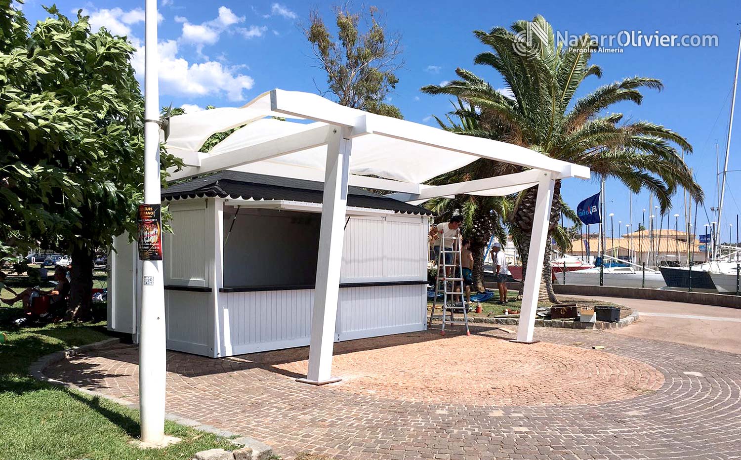 La construcción se transporta equipada con la instalación eléctrica sujeta a normativa lista para funcionar. El quiosco cuenta con una pérgola adosada construida en madera laminada con pilares extra plomados con cubierta en pvc micro perforado.
