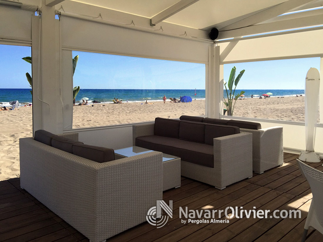 Pérgola desmontable de 100 m2 a 2 aguas pon paramento que esconden la pendiente, construida en vigas de madera laminada G L24, maciza C24 con cubierta en pvc ignífugo, la terraza cuenta además con un cerramiento vertical con toldos enrrollables corta viento sobre guías de aluminio.