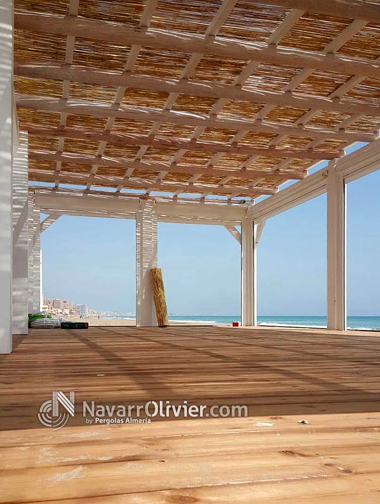 Chiringuito con pérgola de sombraje, tarima anti deslizante ranurada, módulo de aseos accesibles y pasarela pilotada de acceso.