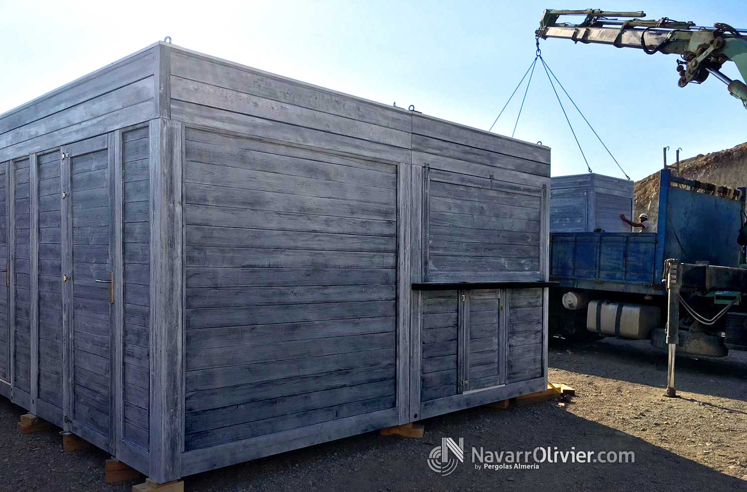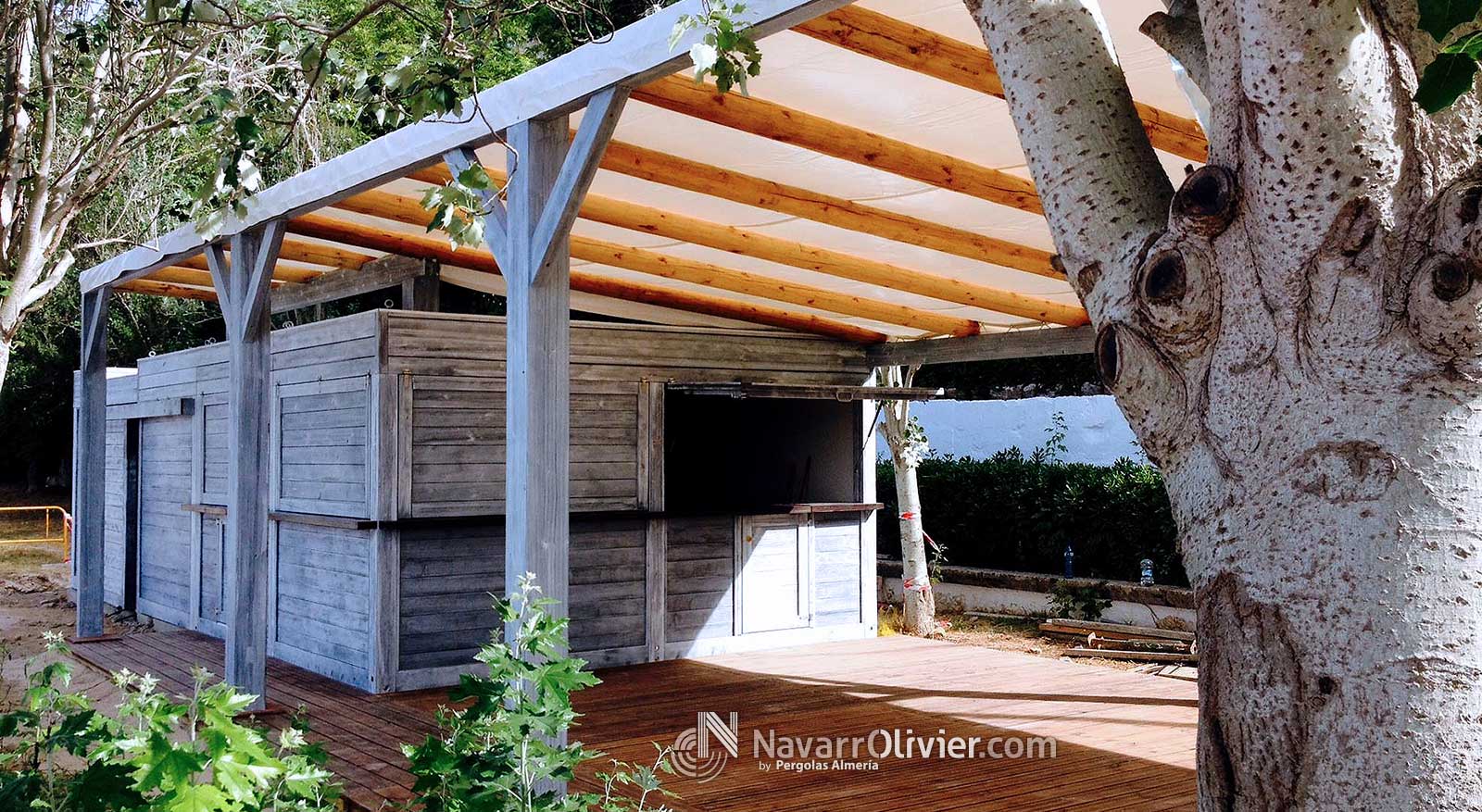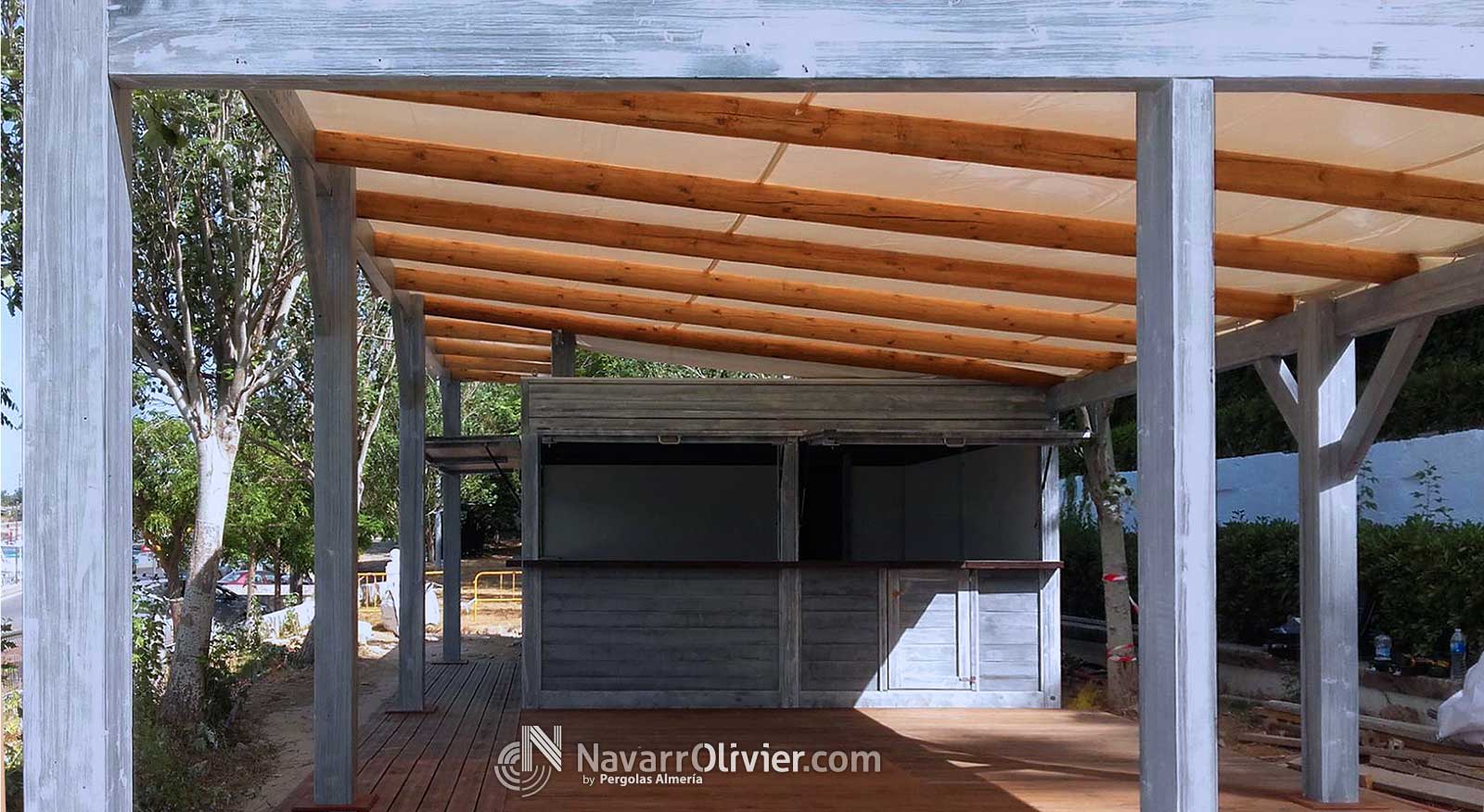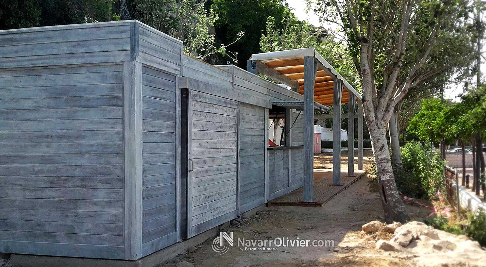 El suelo de la terraza se compone de módulos de tarima antideslizante tratada en autoclave. La pérgola que cubre la terraza esta construida en madera laminar con el mismo acabado que el Chiringuito, las correas de la cubierta esta realizada con palo redondo torneado calibrado.Fabricación y montaje de chiringuito modular de 30 m2 con módulo de aseo accesible y terraza.
