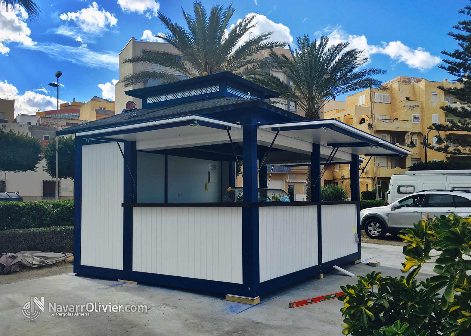 Chiringuito modelo Mojácar, unidad desmontable a tres aguas compuesta por 2 módulos para facilitar el transporte por carretera, coronado por un campanil a cuatro aguas con rejillas de ventilación en acero galvanizado.