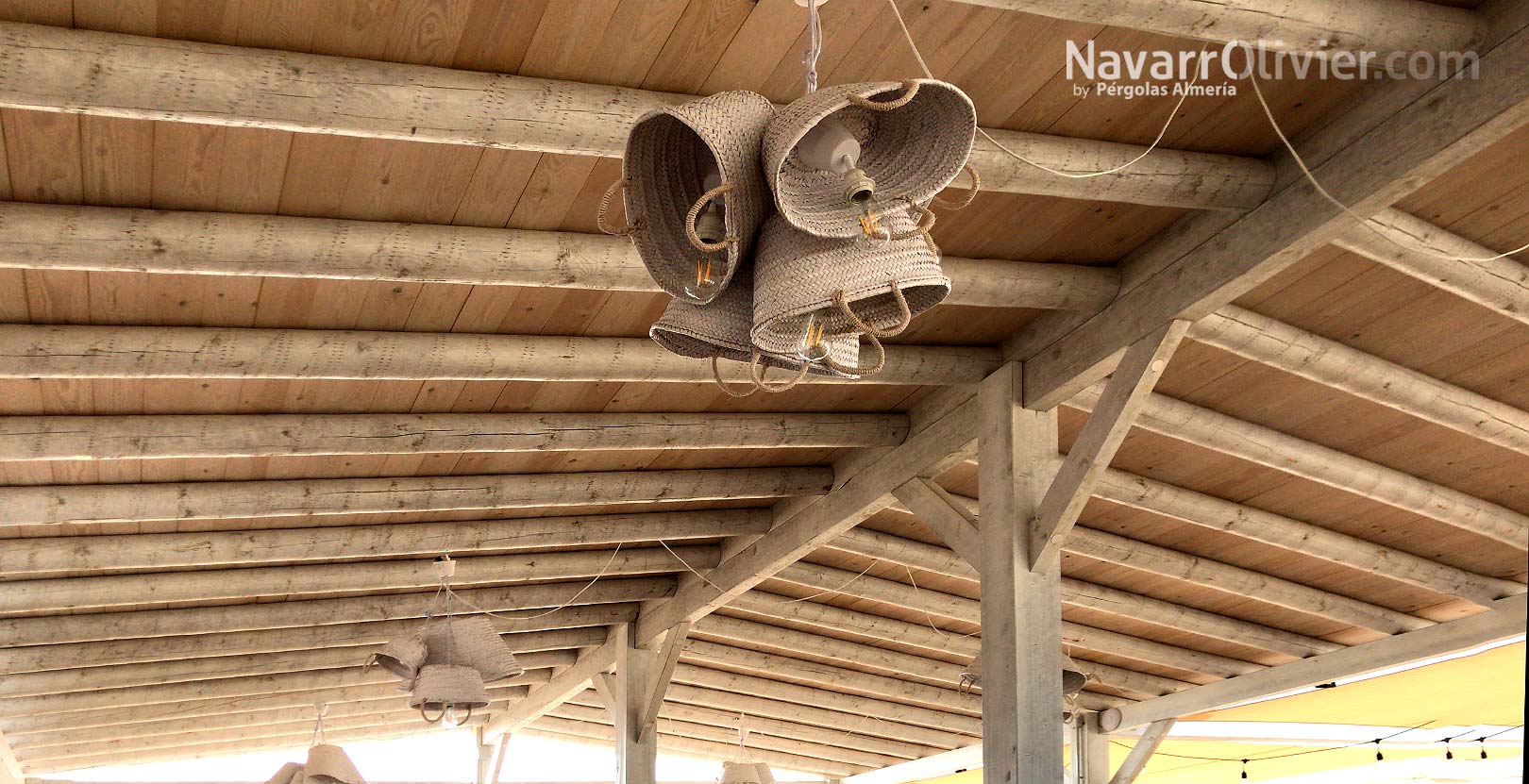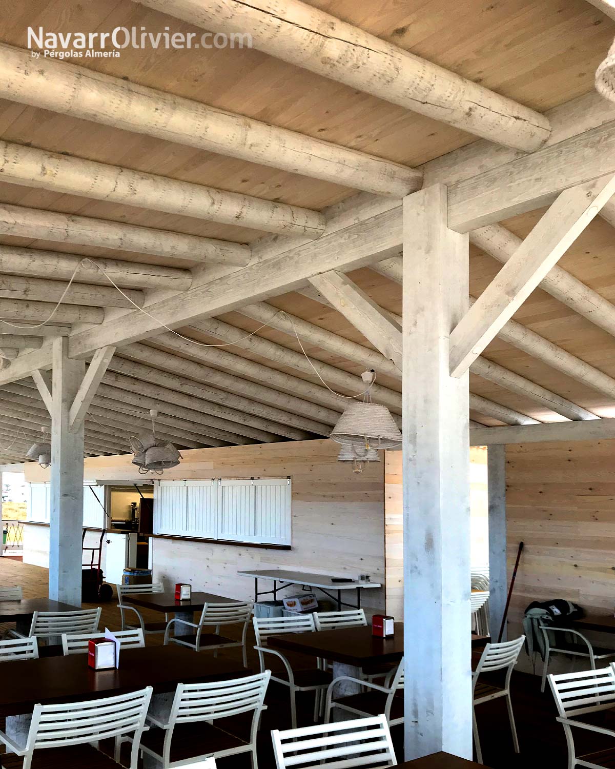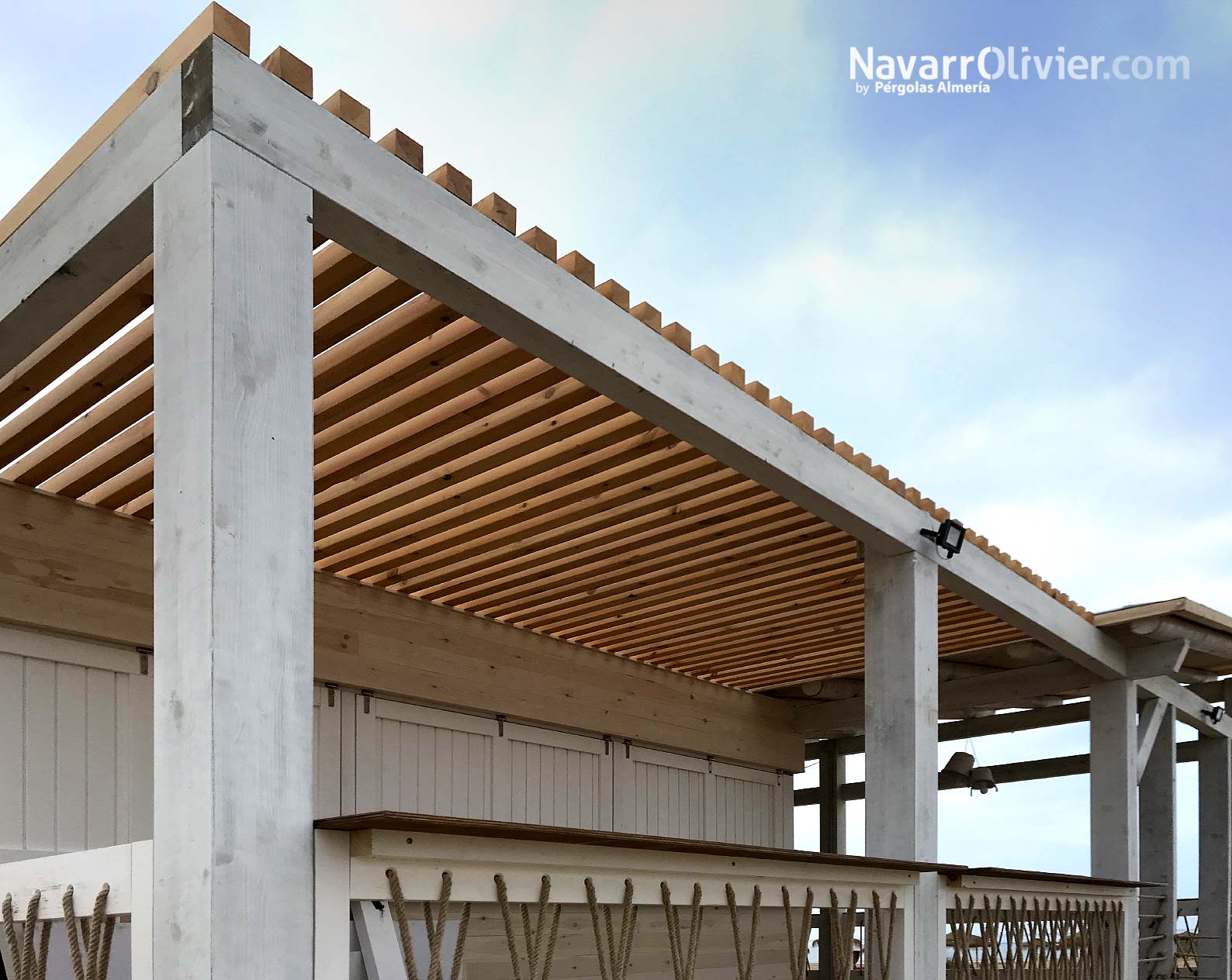 La zona de terraza comedor cuenta con cubierta a 2 aguas con una estructura en madera laminada y tronco calibrado acabados en blanco con pátina vintage y friso en madera aserrada con impermeabilización. La zona de tapeo y transito tienen un sombraje en listones paralelos, el perímetro de la terraza cuenta con una barandilla en madera y cuerda natural.