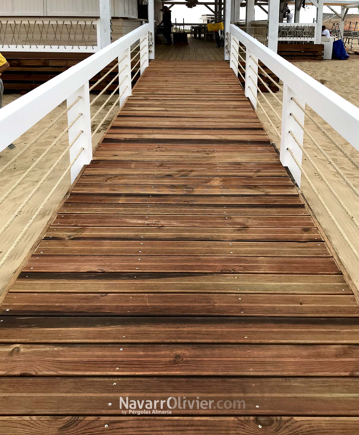El pavimento de la plataforma esta construido en lamas de tarima autoclave con ranurado antideslizante y cantos romos. La terraza elevada cuenta con rampa de acceso y escaleras rematadas en tarima autoclave.