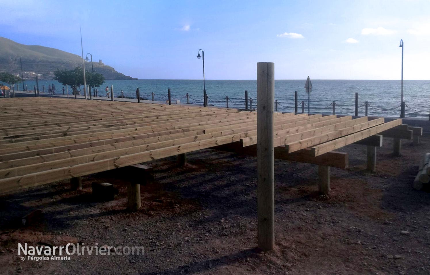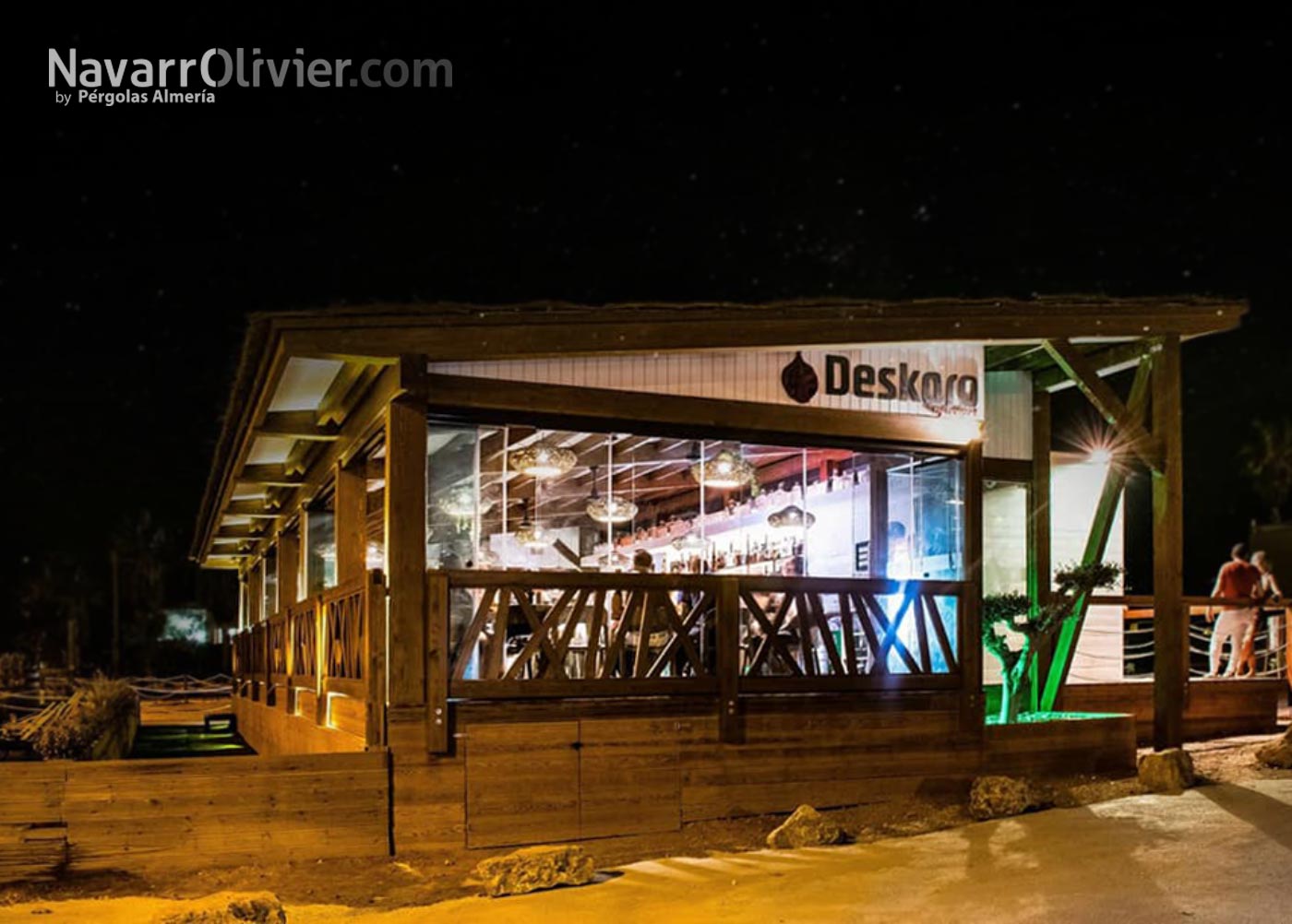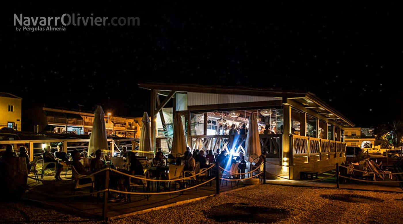 La construcción realizada en madera para exterior sobre pilotes cilíndricos de pino tratado en autoclave destaca por diseño y decoración que lo convierten en lugar único para disfrutar de su oferta de ocio y gastronomía.