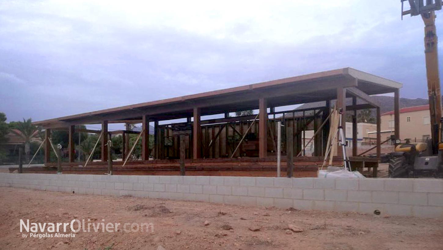 La edificación construida en entramado pesado se asienta sobre la plataforma y consta de una estructura principal fabricada en madera laminada y maciza mecanizada tratada con barniz de poro abierto para su protección.