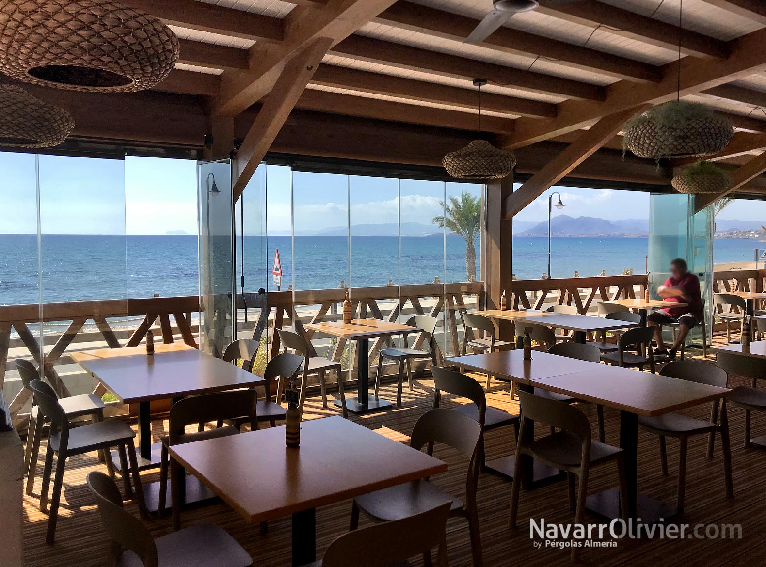 La terraza del restaurante cuenta con una barandilla de diseño en madera tratada, rampas y escaleras de acceso en madera autoclave además de un cerramiento en cortina de cristal.