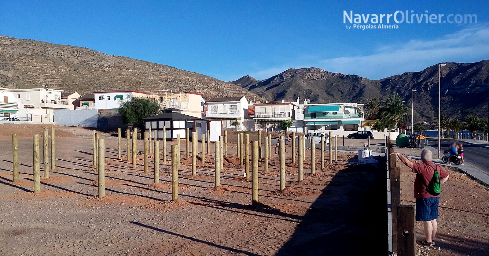 El proyecto de construcción respetuosa con el mediombiente se eleva del suelo en pendiente mediante pilotes de madera, con un entramado de vigas de madera tratada que sirven de forjado generando un vacio sanitario. La superficie de la plataforma cuenta con suelo en tarima tratada en autoclave en la zona de comedor y pavimento en tablero de carrocería en la zona de cocina, barra, almacén y aseos.