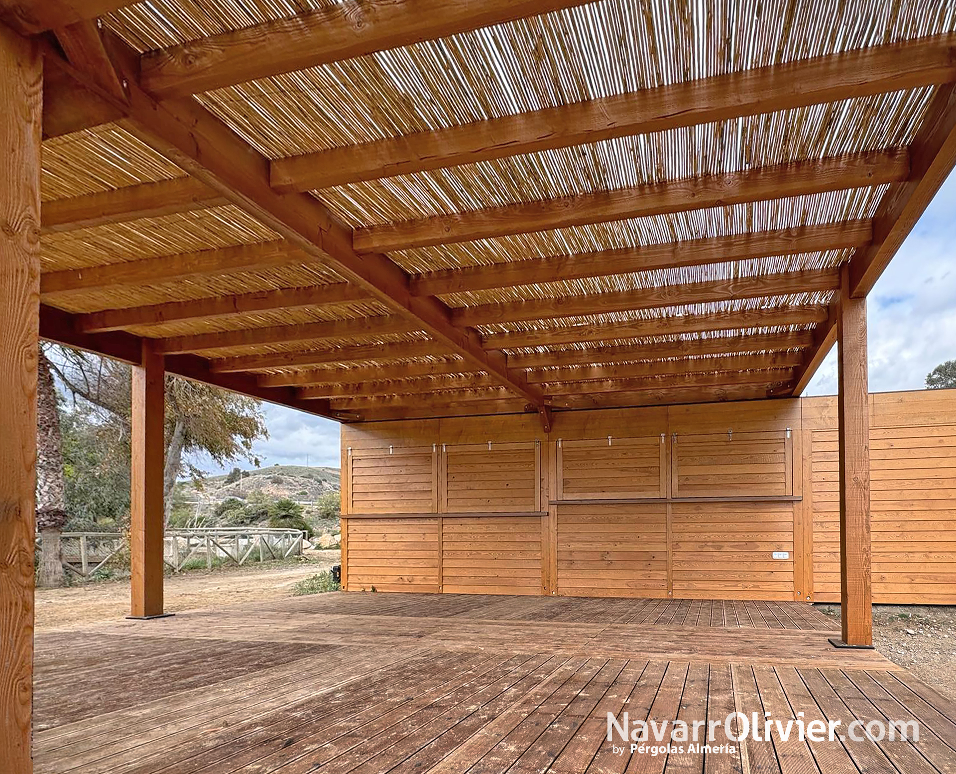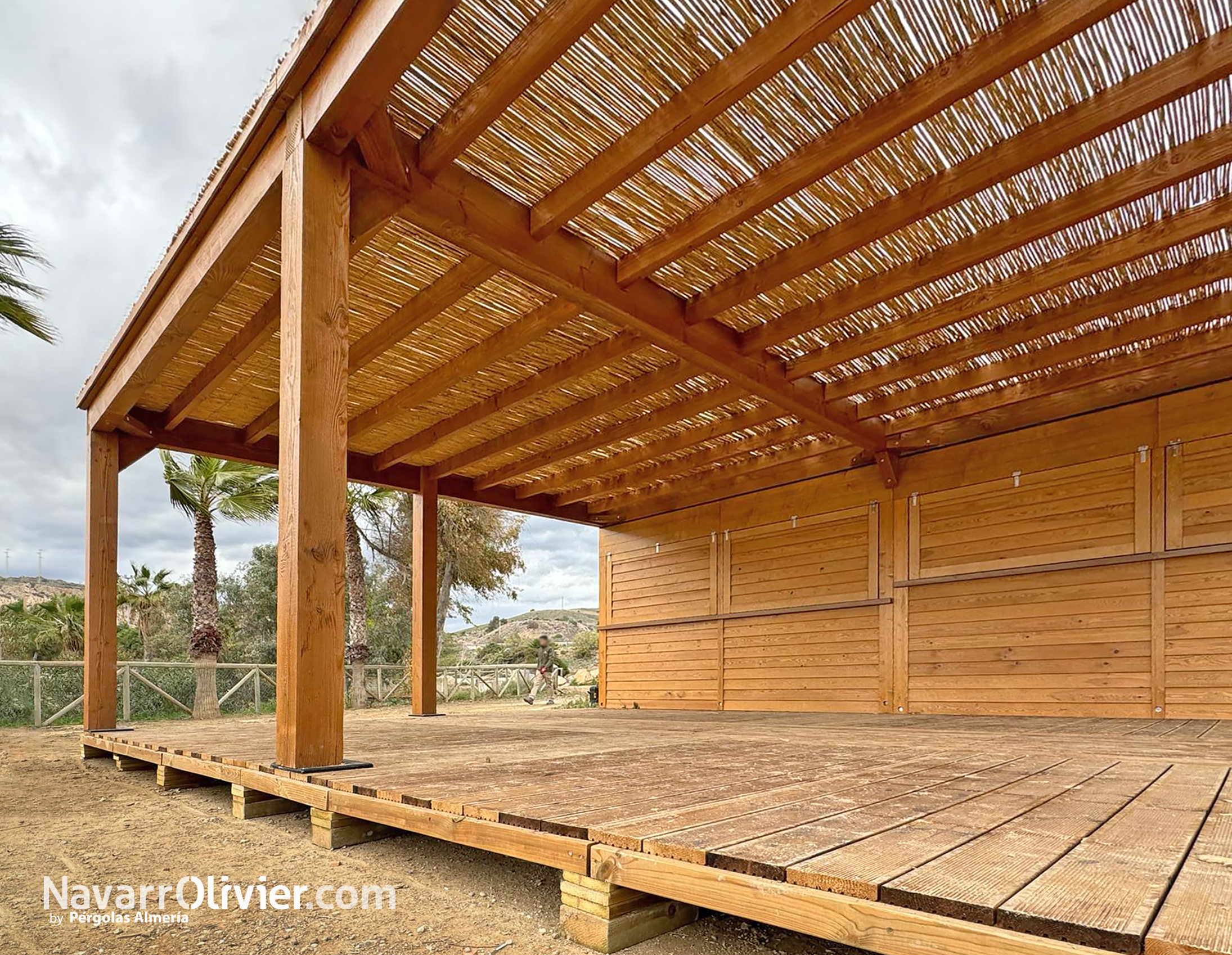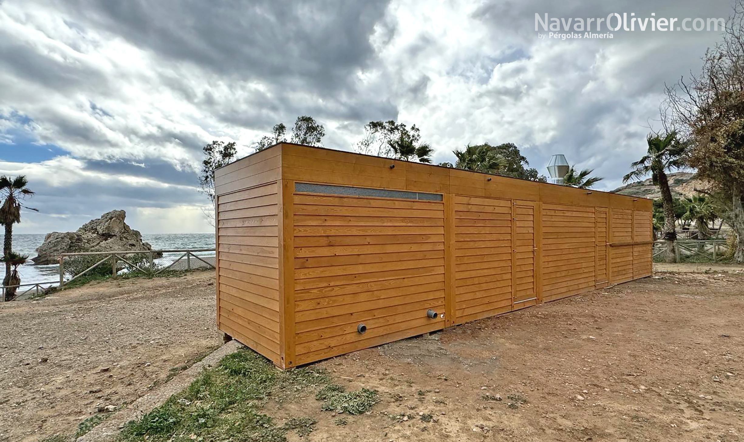 La terraza del chiringuito cuenta con tarima autoclave y pérgola de sombraje que protege a los clientes del sol y la lluvia.