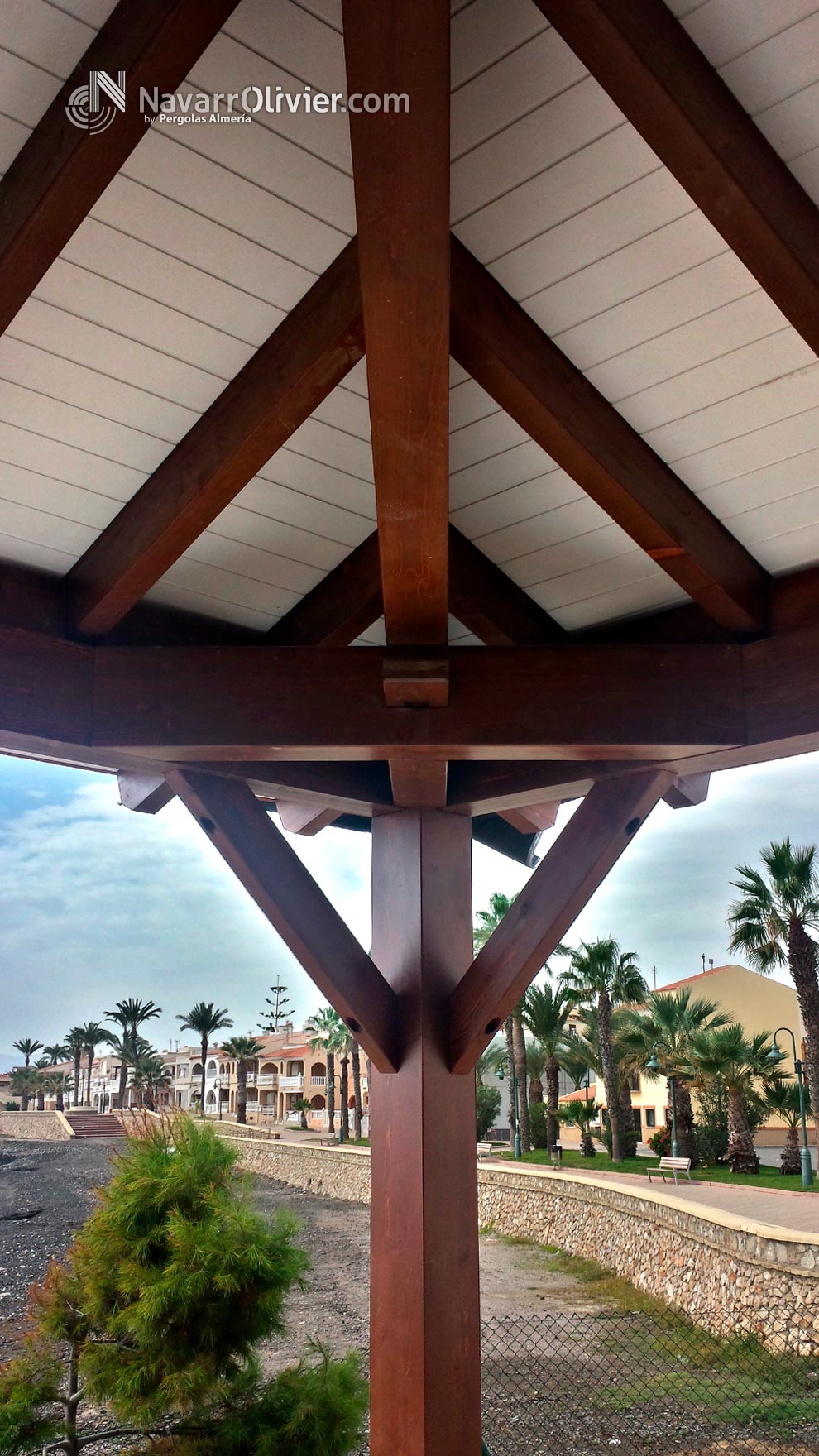 La estructura cuenta con una cubierta poligonal en madera laminada y maciza con friso en tablero fenólico acabado en blanco que mejora la luminosidad interior y pone en valor la estética de de la carpintería interior. El exterior de la misma cuenta con un recubrimiento en brezo natural.