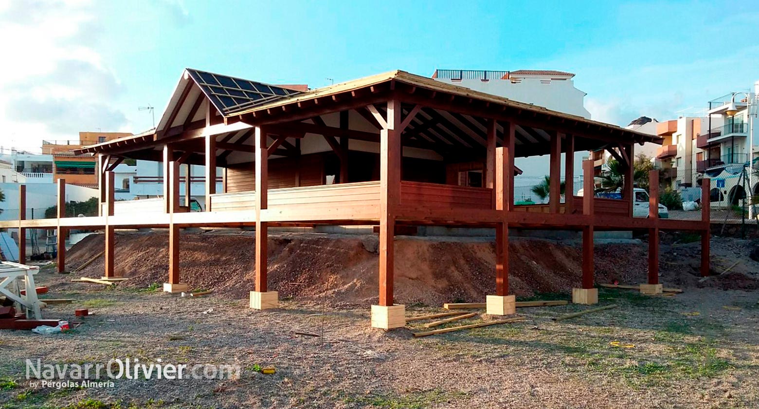 El chiringuito cuenta ademas con una terraza exterior elevada sobre pilares de madera que sortean el desnivel del terreno, su construcción cuenta con un entramado de vigas de madera tratada con pavimento en tarima ranurada en autoclave clase IV.
