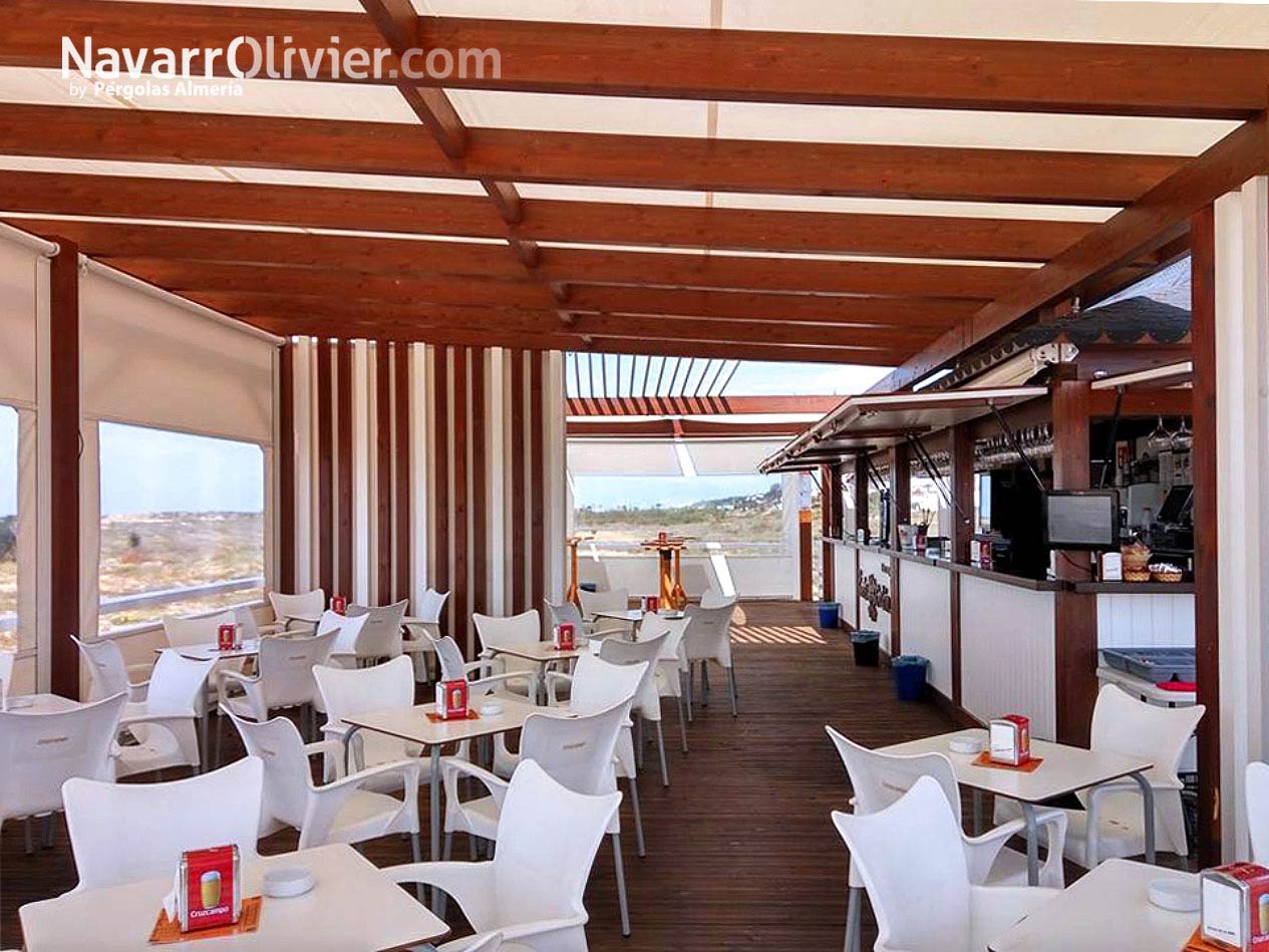 La terraza elevada cuenta con rampas de acceso para personas con movilidad reducida y escaleras ademas de el sombraje que aporta la pérgola de diseño en madera laminada con diferentes tipos de cubiertas en pvc.