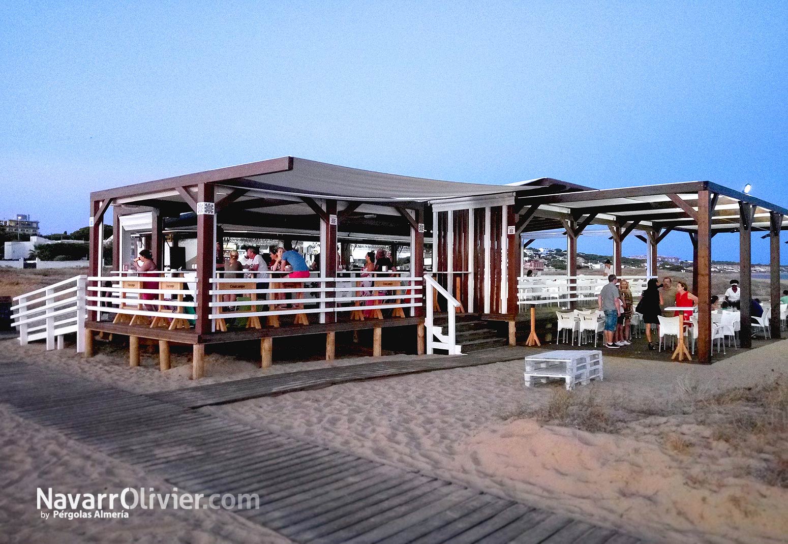 La construcción pilotada en palo calibrado tratado en autoclave se eleva del suelo para minimizar el impacto sobre el sistema de dunas. La plataforma pilotada ocupa un total de 150 m2 y cuenta con un forjado con tarima autoclave ranurado como pavimento. Del total de la superficie 40 m2 se ocupan en el chiringuito construido en módulos equipados con instalación eléctrica. La configuración permite albergar una zona de cocina, almacenaje y bar.