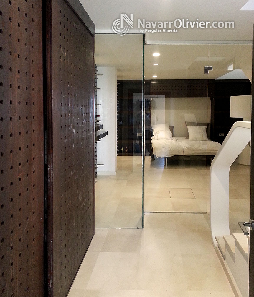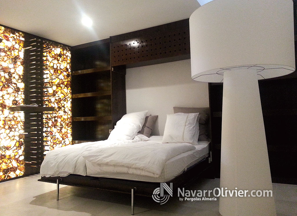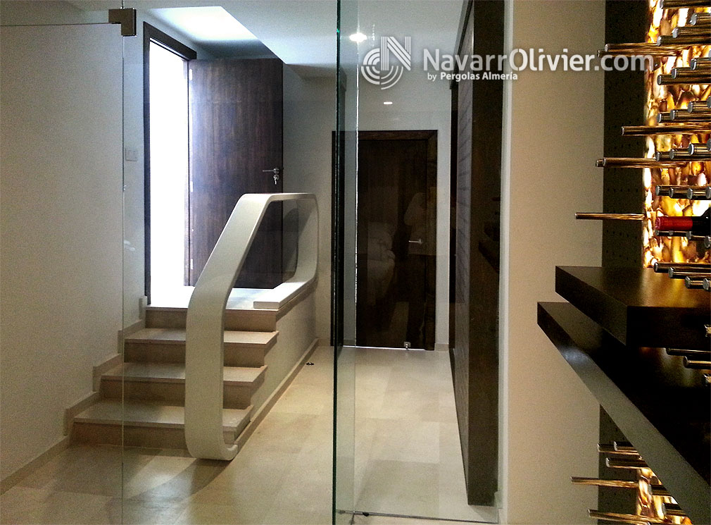 Intervención realizada para Muxacra Arquitectos en el proyecto Casa Beirholm ubicada en Macenas Beach & Golf Resort. La zona afectada es una dependencia pensada como habitación de invitados y bodega personal. Siguiendo con la estética y sistemas constructivos utilizados en otras zonas de la vivienda se construyo un pasamanos continuo en madera lacada en blanco, ademas se fabricaron las puertas mecanizadas en madera para el almacenamiento de vinos, un expositor decorativo madera acabada en color wengue combinada con silestone translucido iluminado por led con estanterías y bárrales de acero para exponer botellas. Para acondicionar la habitación de invitados la carpintería a medida incluye una cama abatible de 2 plazas, que se oculta siguiendo la estética del mobiliario.