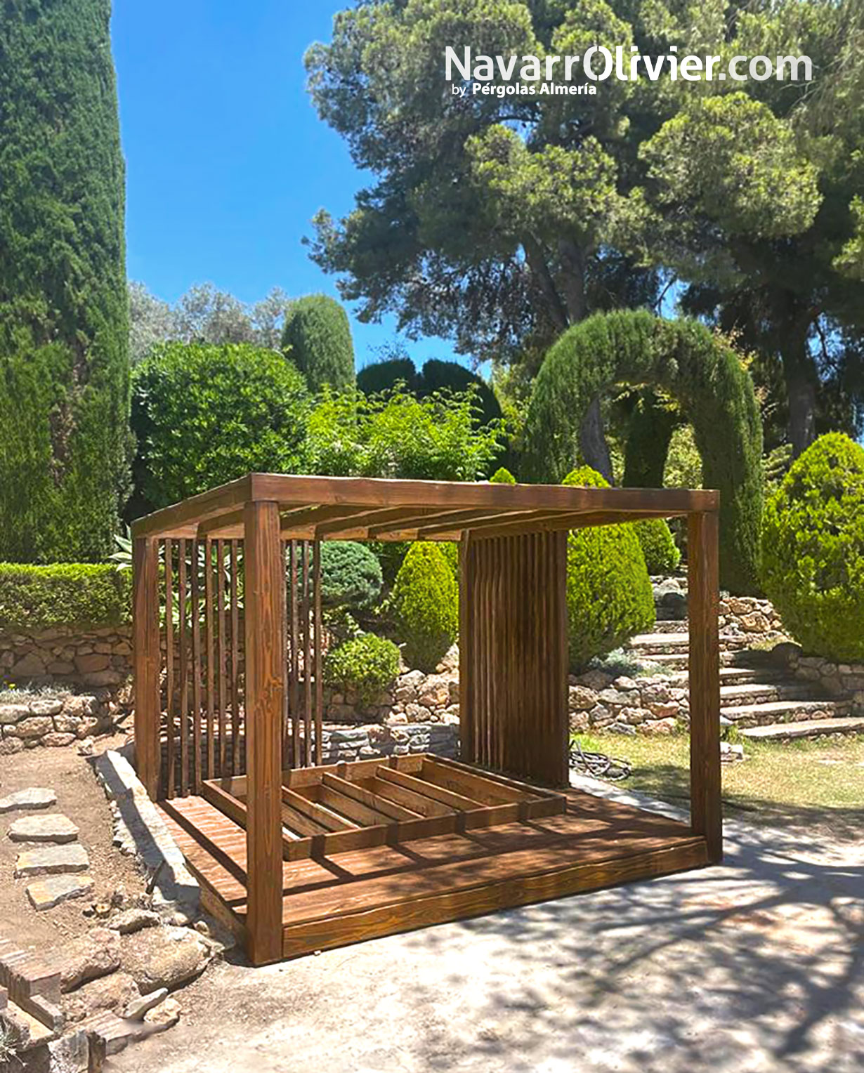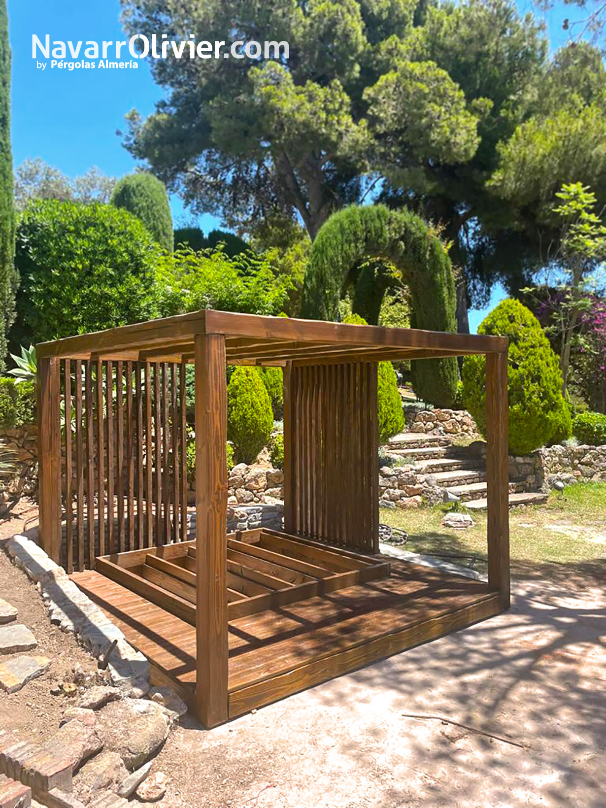 La estructura de sombraje está compuesta por cuatro pilares principales de madera maciza de acabado rústico con dos zonas de vigas verticales paralelas que filtran aportan privacidad y estética.