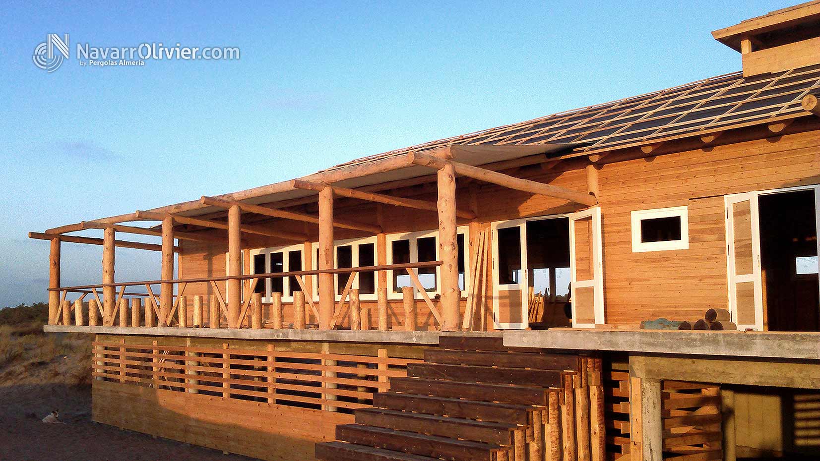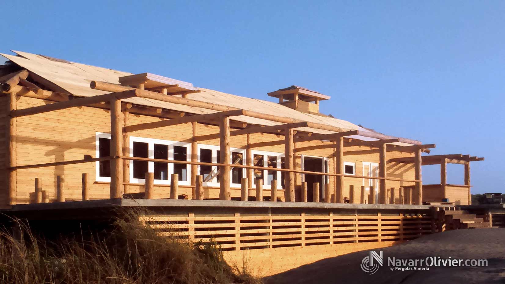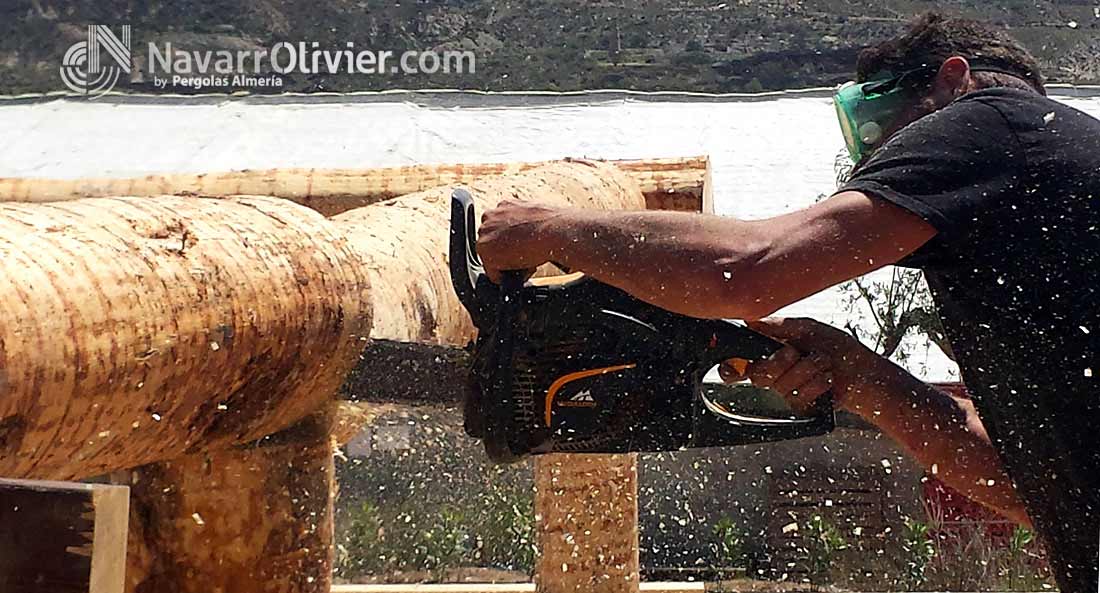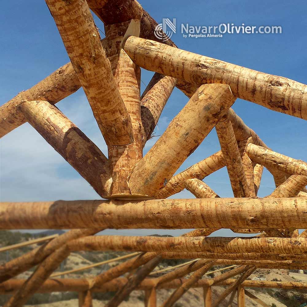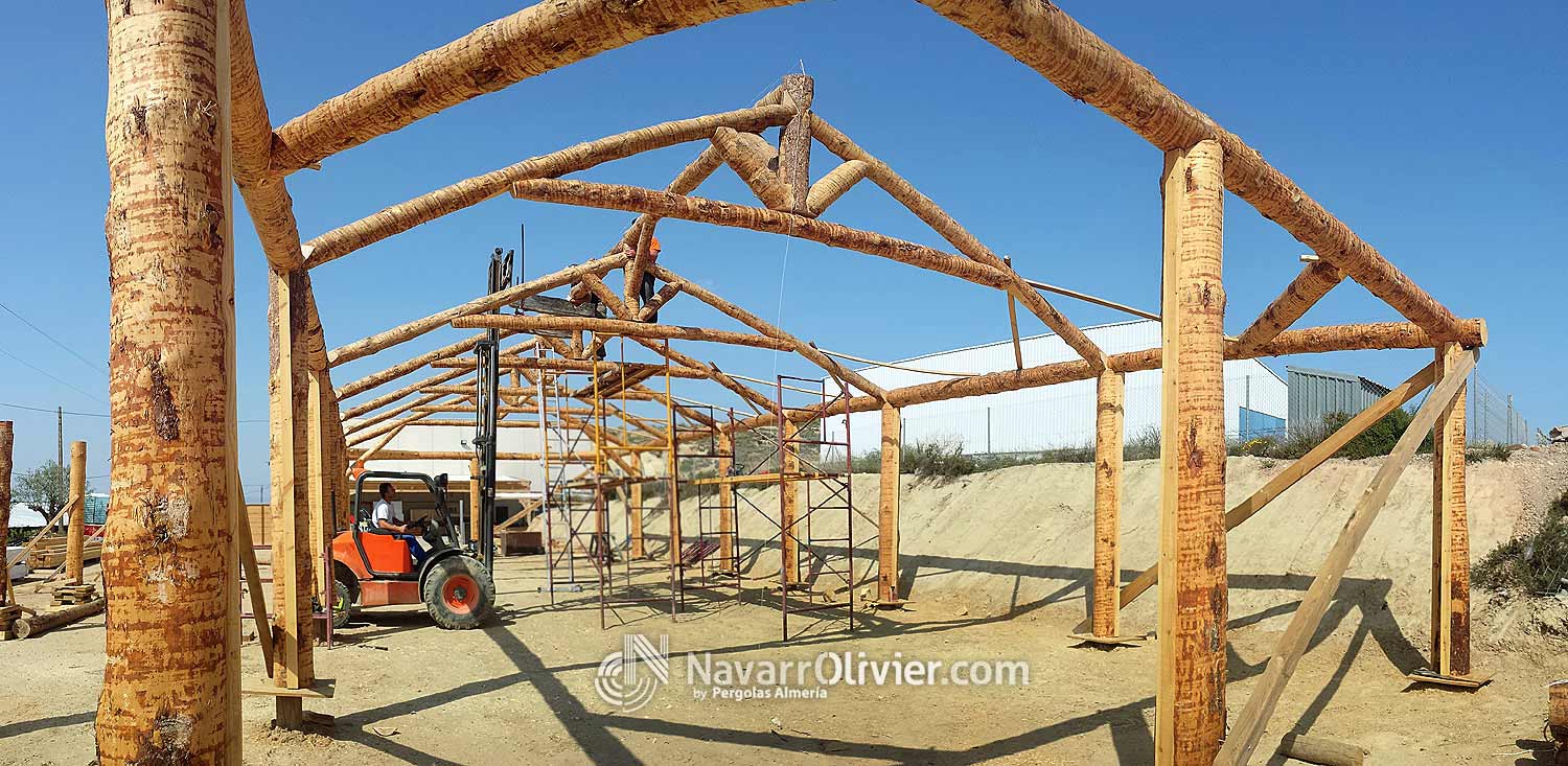 Estructura principal realizada en pino natural descortezado, arenado despues de tallar para simular la madera de deriba.