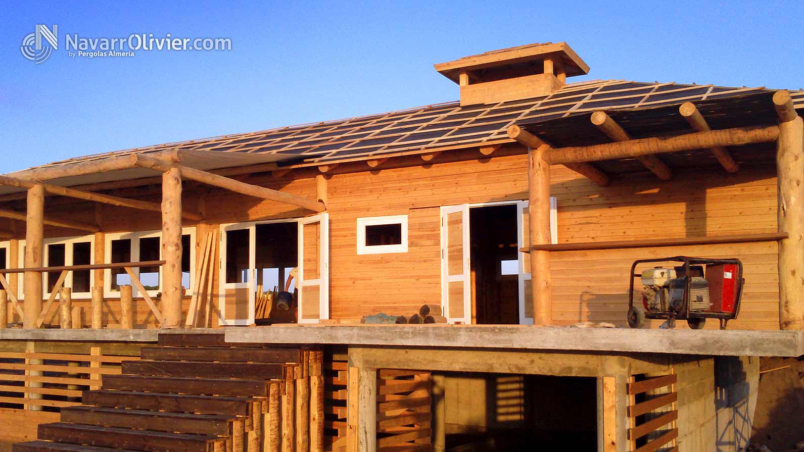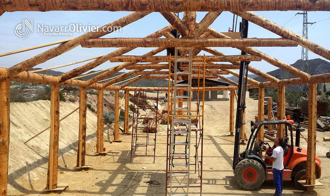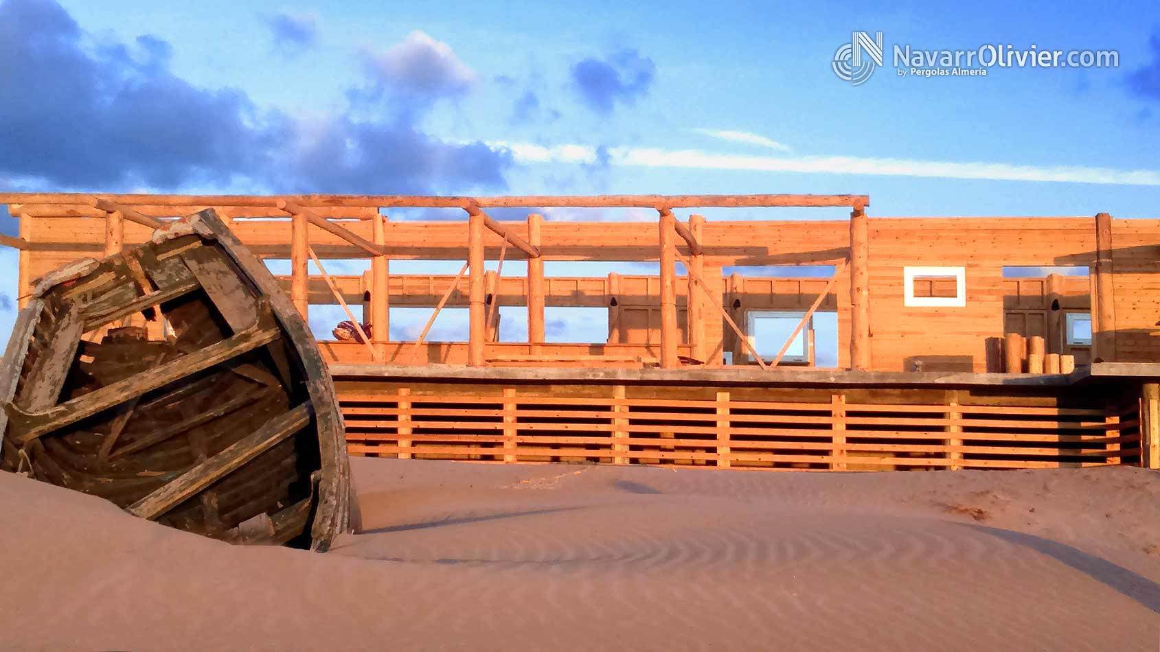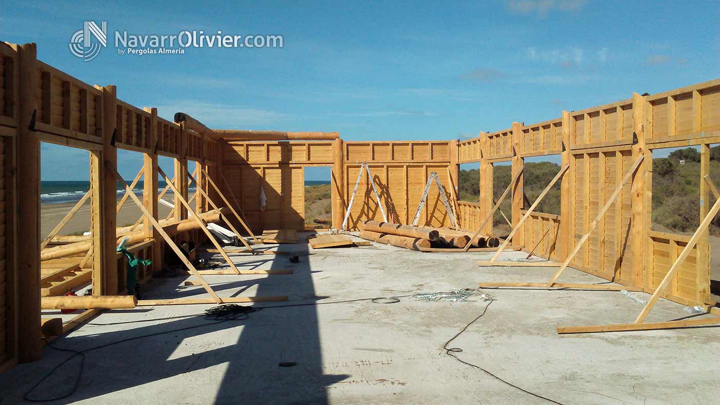 Estructura principal realizada en pino natural descortezado, arenado despues de tallar para simular la madera de deriba.