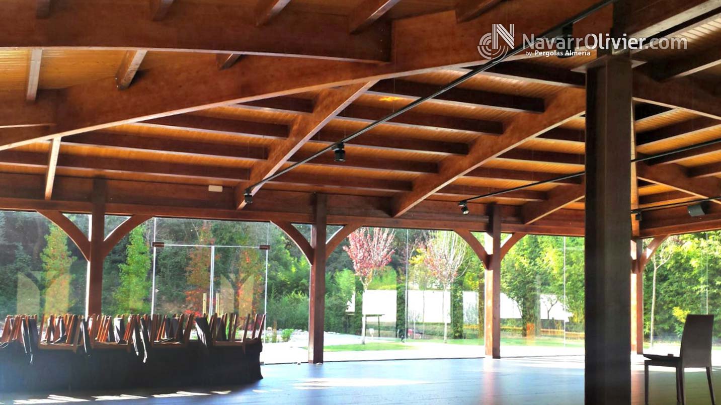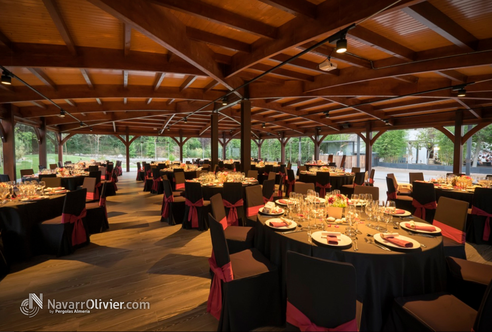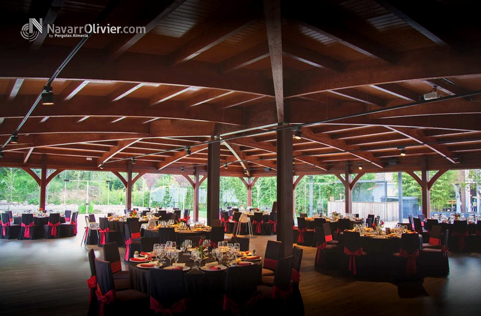 Construcción en madera estructural de cubierta de grandes luces en vigas de madera laminada curva. Estructura en madera estructural laminada con cubierta tipo cúpula con pilares centrales de apoyo en ipn. Dado el uso de la construcción como salón de celebraciones y eventos se requería un gran espacio diáfano que permita diferentes decoraciones y configuraciones así también como una eficiente aislación térmica y acústica para lo cual se opto por panel sandwich compuesto de friso de madera machihembrada vista, núcleo de poliuretano de 120 mm y estructura exterior en tablero hidrófugo impermeabilizado con tela asfáltica sellada por calor acabado exterior en brezo decorativo. Para el cerramiento perimetral se opto por cortina de cristal que permite continuidad con el jardín en caso de que la celebración se realiza en la temporada estival. Masía Mas Llombart es un excelente ejemplo de eficiencia y funcionalidad aplicado a la construcción de estructuras en madera estructural.