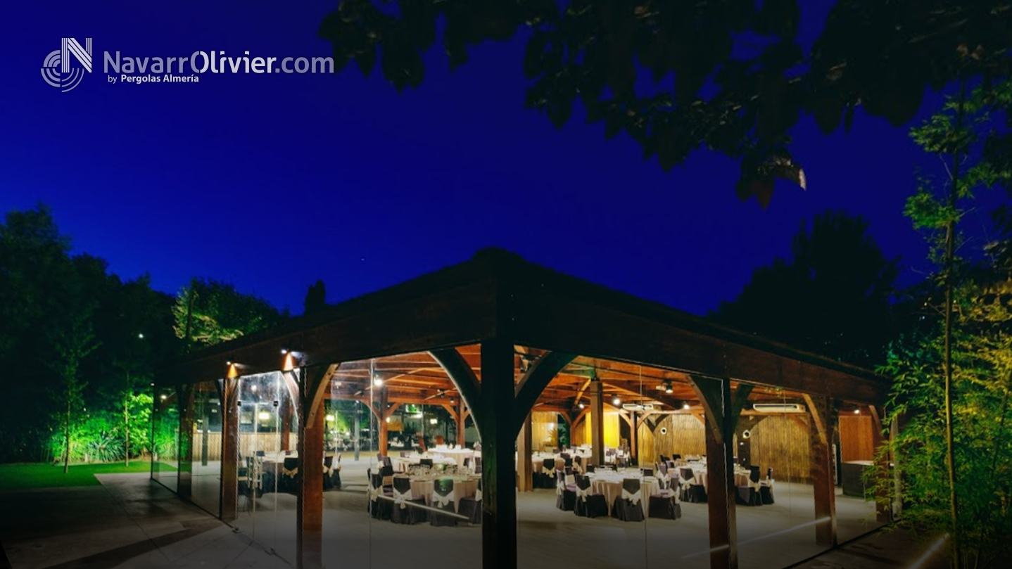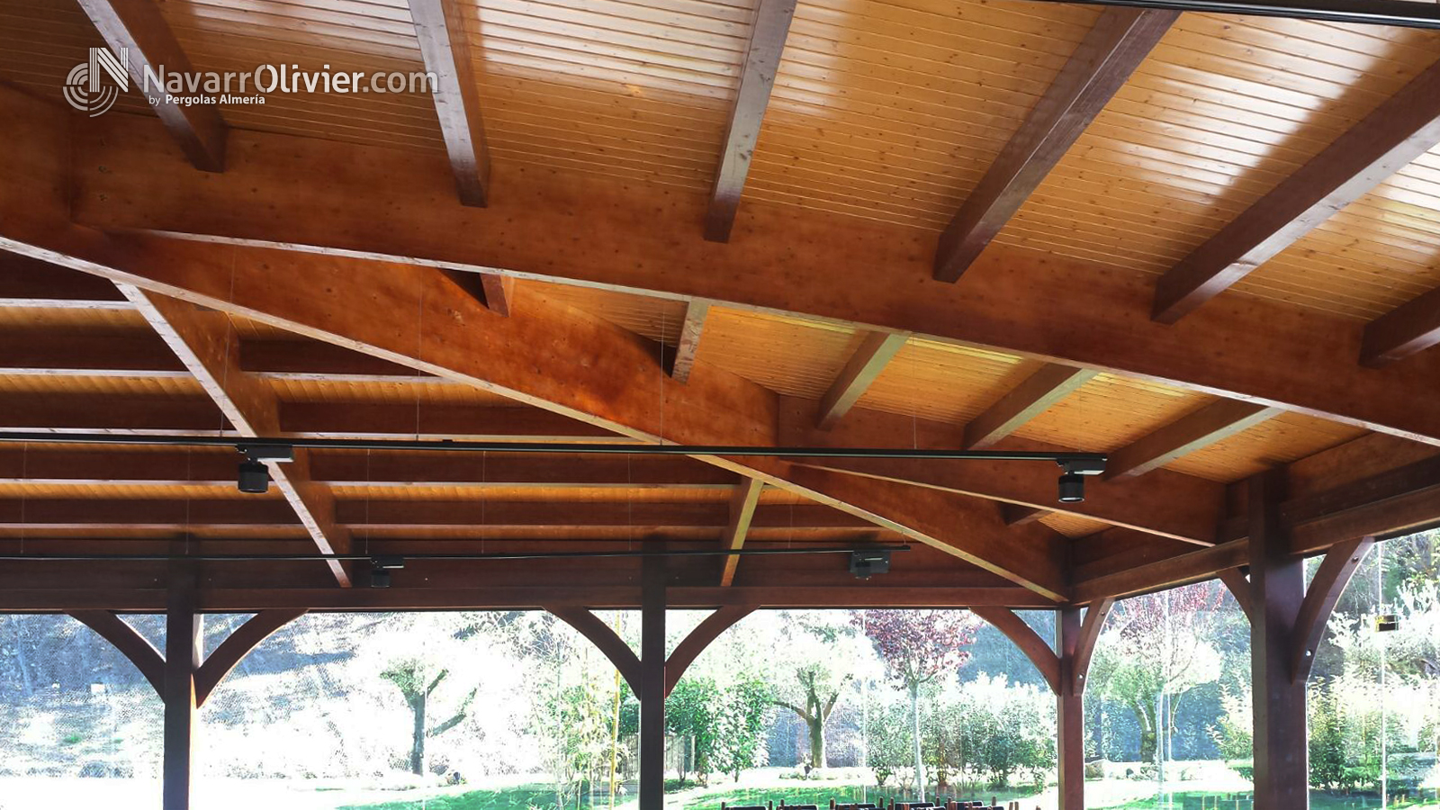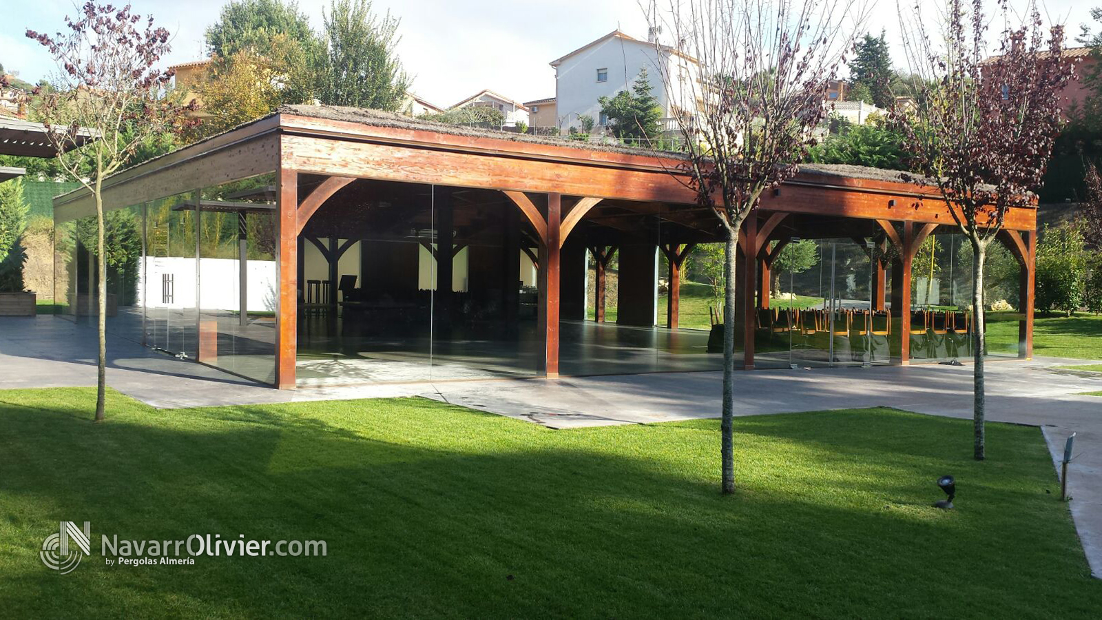 Construcción en madera estructural de cubierta de grandes luces en vigas de madera laminada curva. Estructura en madera estructural laminada con cubierta tipo cúpula con pilares centrales de apoyo en ipn. Dado el uso de la construcción como salón de celebraciones y eventos se requería un gran espacio diáfano que permita diferentes decoraciones y configuraciones así también como una eficiente aislación térmica y acústica para lo cual se opto por panel sandwich compuesto de friso de madera machihembrada vista, núcleo de poliuretano de 120 mm y estructura exterior en tablero hidrófugo impermeabilizado con tela asfáltica sellada por calor acabado exterior en brezo decorativo. Para el cerramiento perimetral se opto por cortina de cristal que permite continuidad con el jardín en caso de que la celebración se realiza en la temporada estival. Masía Mas Llombart es un excelente ejemplo de eficiencia y funcionalidad aplicado a la construcción de estructuras en madera estructural.