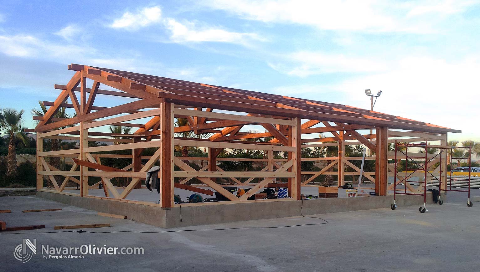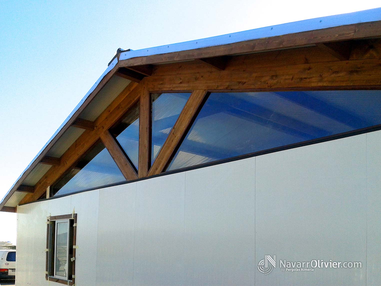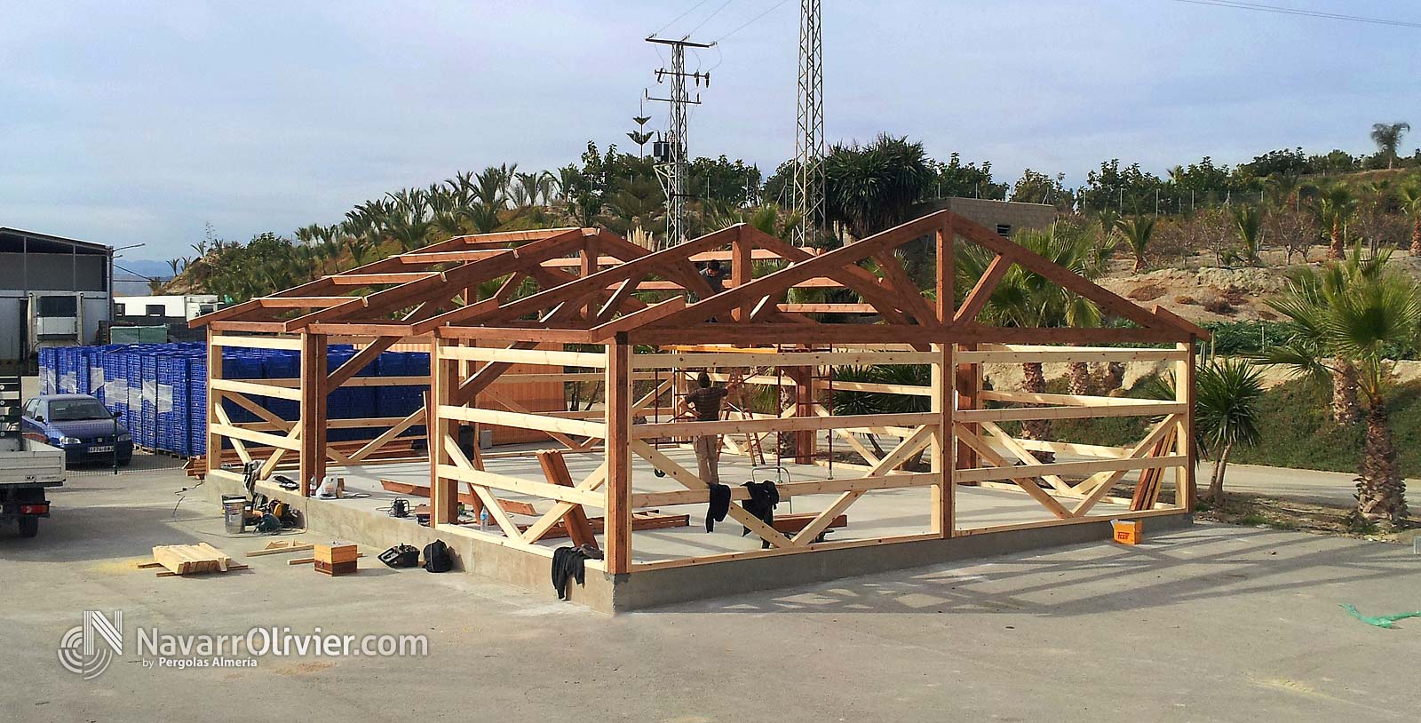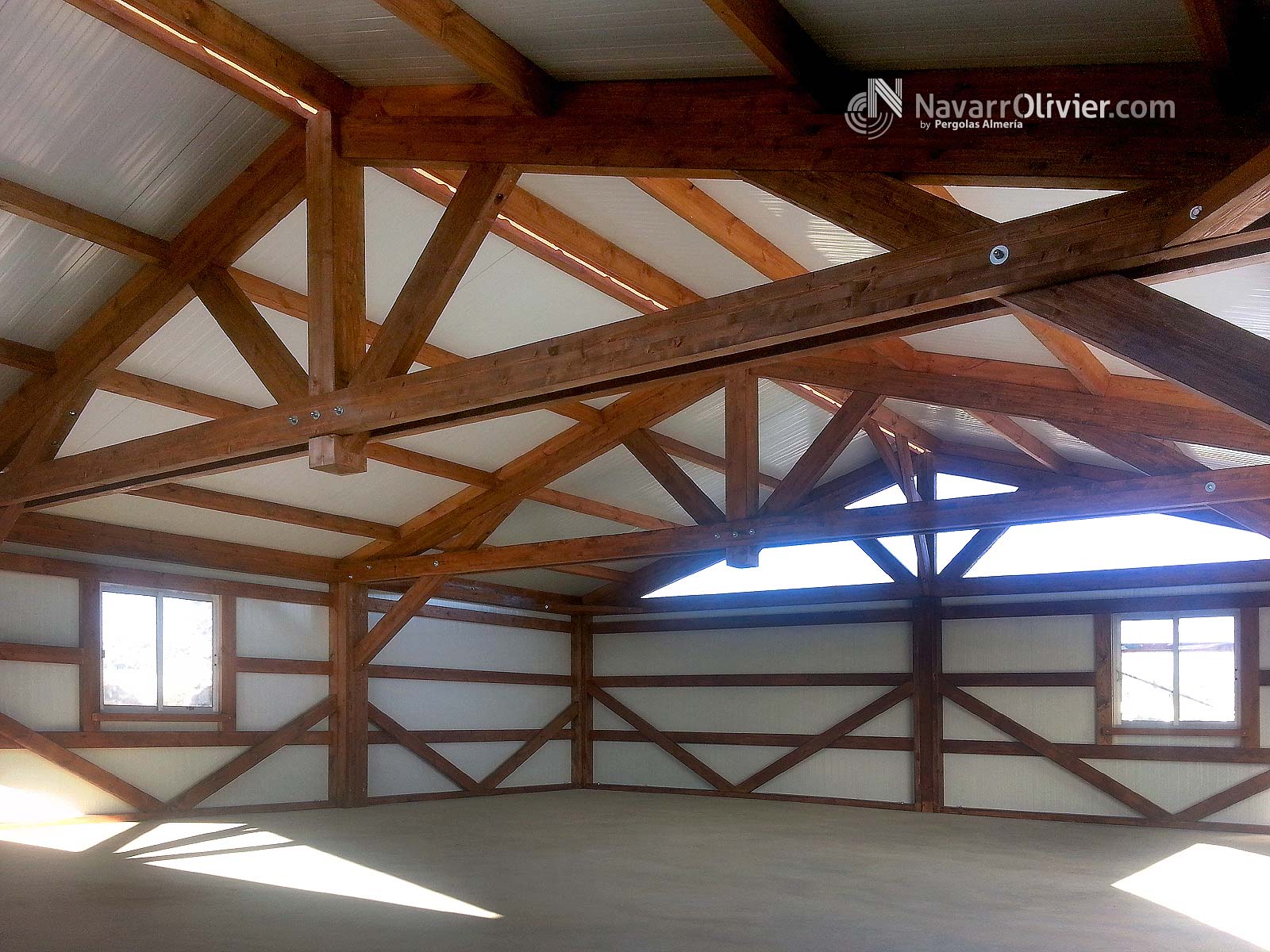 Construcción de nave agrícola destinada a comedor de uso común de los trabajadores de la empresa Cuadraspania en Burjulú, Cuevas del Almanzora, Almería. La estructura principal del edificio está implantada sobre un forjado con vacio sanitario construido en cemento, los pilares principales al igual que las 4 cerchas están fabricadas en madera laminada encolada sujeta mediante mecanizado y varillas roscada, para las vigas secundarias de la construcción se utilizo madera maciza. La cubierta con pendiente a 2 aguas esta cubierta con paneles sandwich autoportantes de aluminio que le aportan impermeabilización y aislamiento. Para los muros perimetrales se opto por el mismo tipo de panel en la variante utilizada para muros. El comedor de superficie diáfana esta bañado por luz natural gracias a las cristaleras que aprovechan los espacios triangulares de la contra forma interior delas cerchas.
