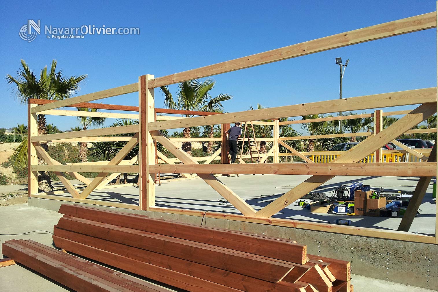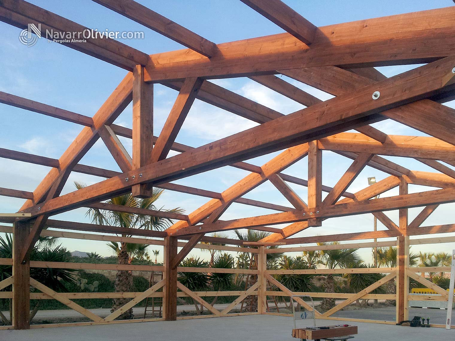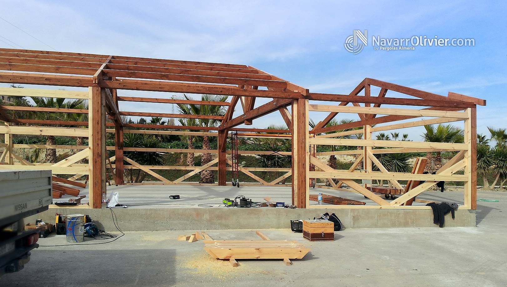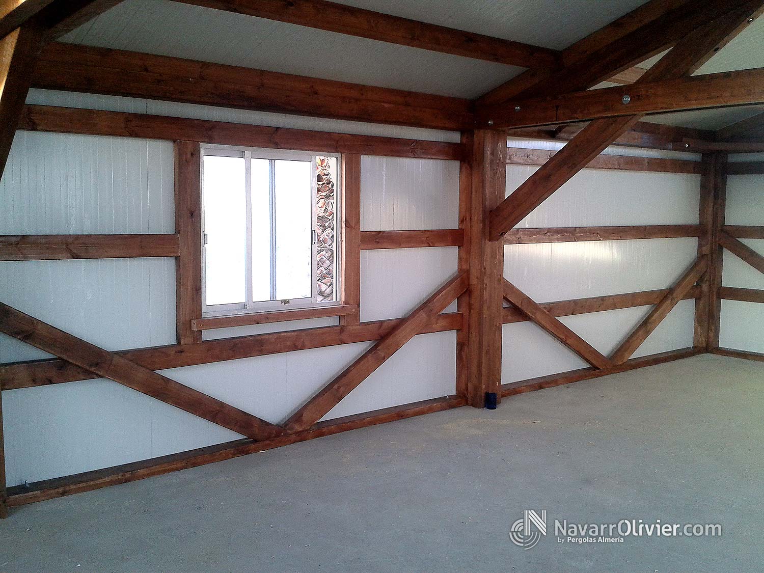 Construcción de nave agrícola destinada a comedor de uso común de los trabajadores de la empresa Cuadraspania en Burjulú, Cuevas del Almanzora, Almería. La estructura principal del edificio está implantada sobre un forjado con vacio sanitario construido en cemento, los pilares principales al igual que las 4 cerchas están fabricadas en madera laminada encolada sujeta mediante mecanizado y varillas roscada, para las vigas secundarias de la construcción se utilizo madera maciza. La cubierta con pendiente a 2 aguas esta cubierta con paneles sandwich autoportantes de aluminio que le aportan impermeabilización y aislamiento. Para los muros perimetrales se opto por el mismo tipo de panel en la variante utilizada para muros. El comedor de superficie diáfana esta bañado por luz natural gracias a las cristaleras que aprovechan los espacios triangulares de la contra forma interior delas cerchas.