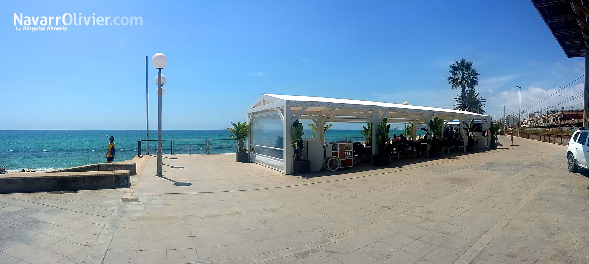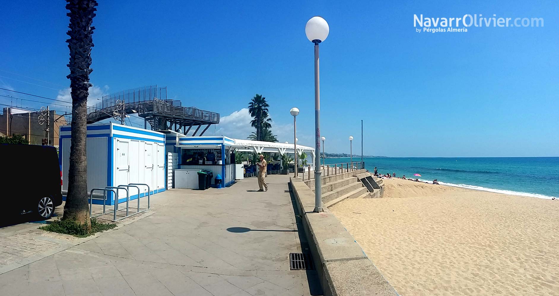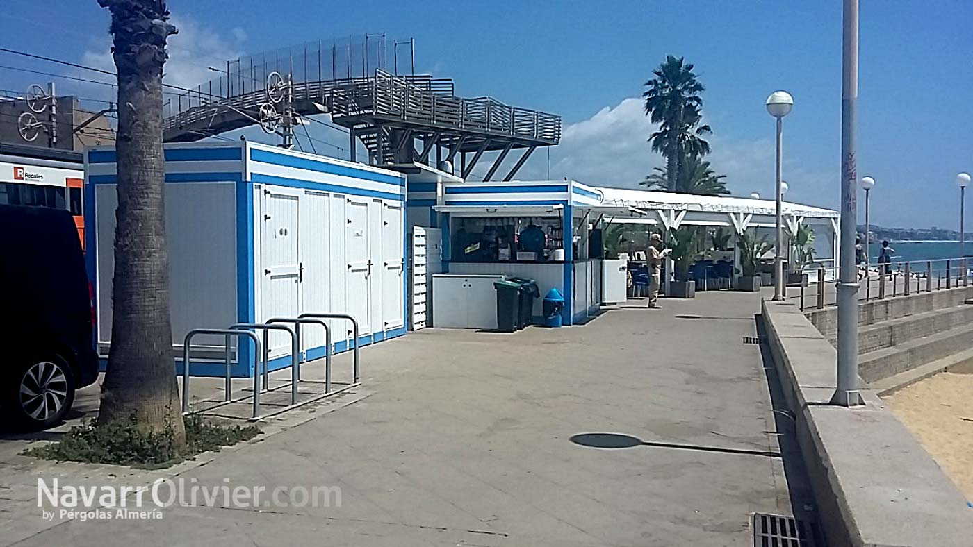 Las instalaciones cuentan con módulo de aseos accesibles para personas con movilidad reducida equipados ademas con cambiadores de bebes. El chiringuito modelo Castelldefels, de 20 m2 ha sido configurado con cocina y zona de bar. Su amplia terraza cubierta con una pérgola de madera para exterior cuenta además con un cerramiento enrrollables que protege de la brisa sin perjudicar las vistas.