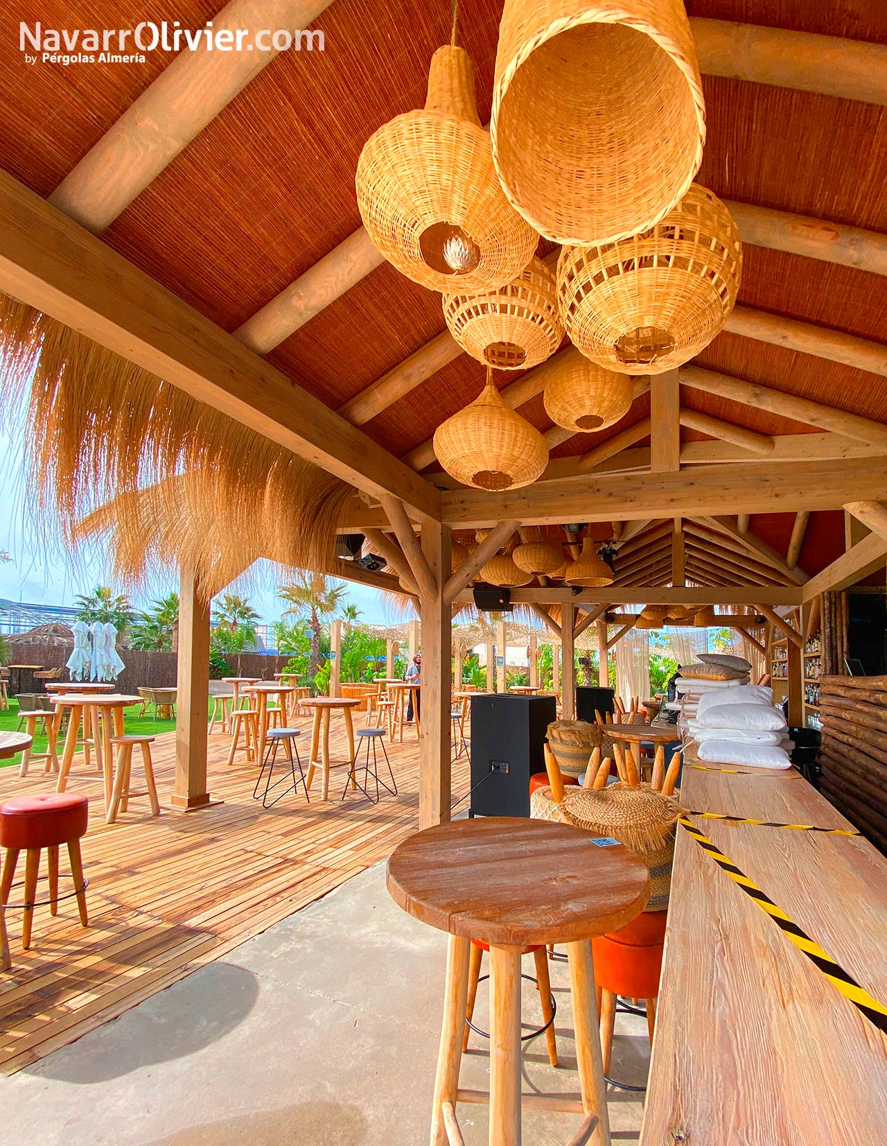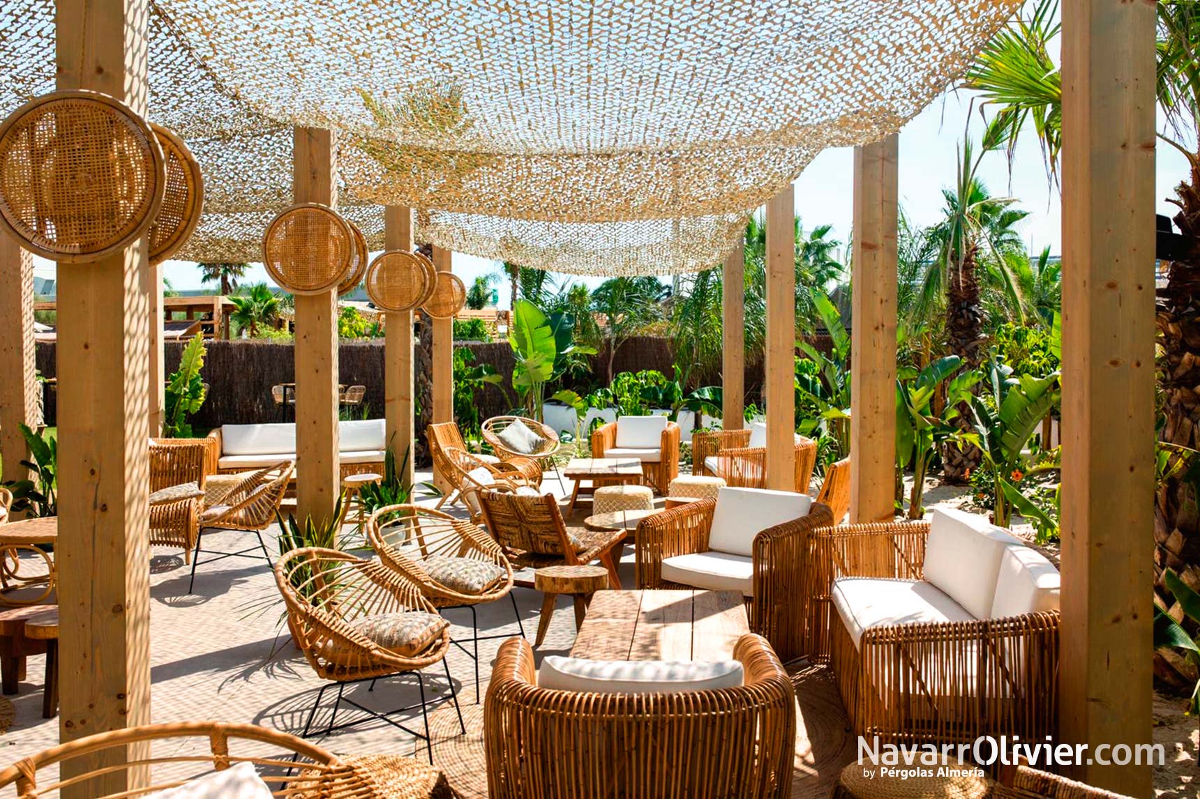 Para este proyecto se buscaba una estética natural para crear un espacio abierto protegido del sol destacando entre los elementos constructivos las fibras naturales.