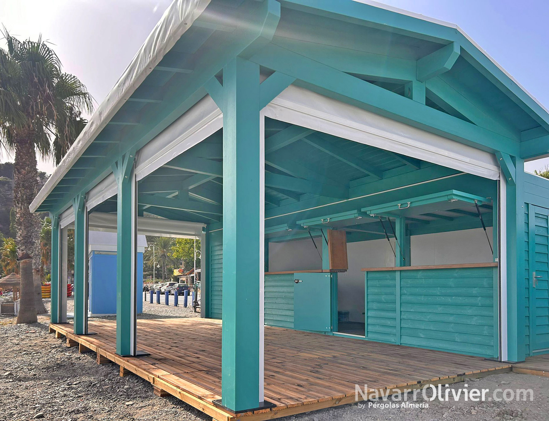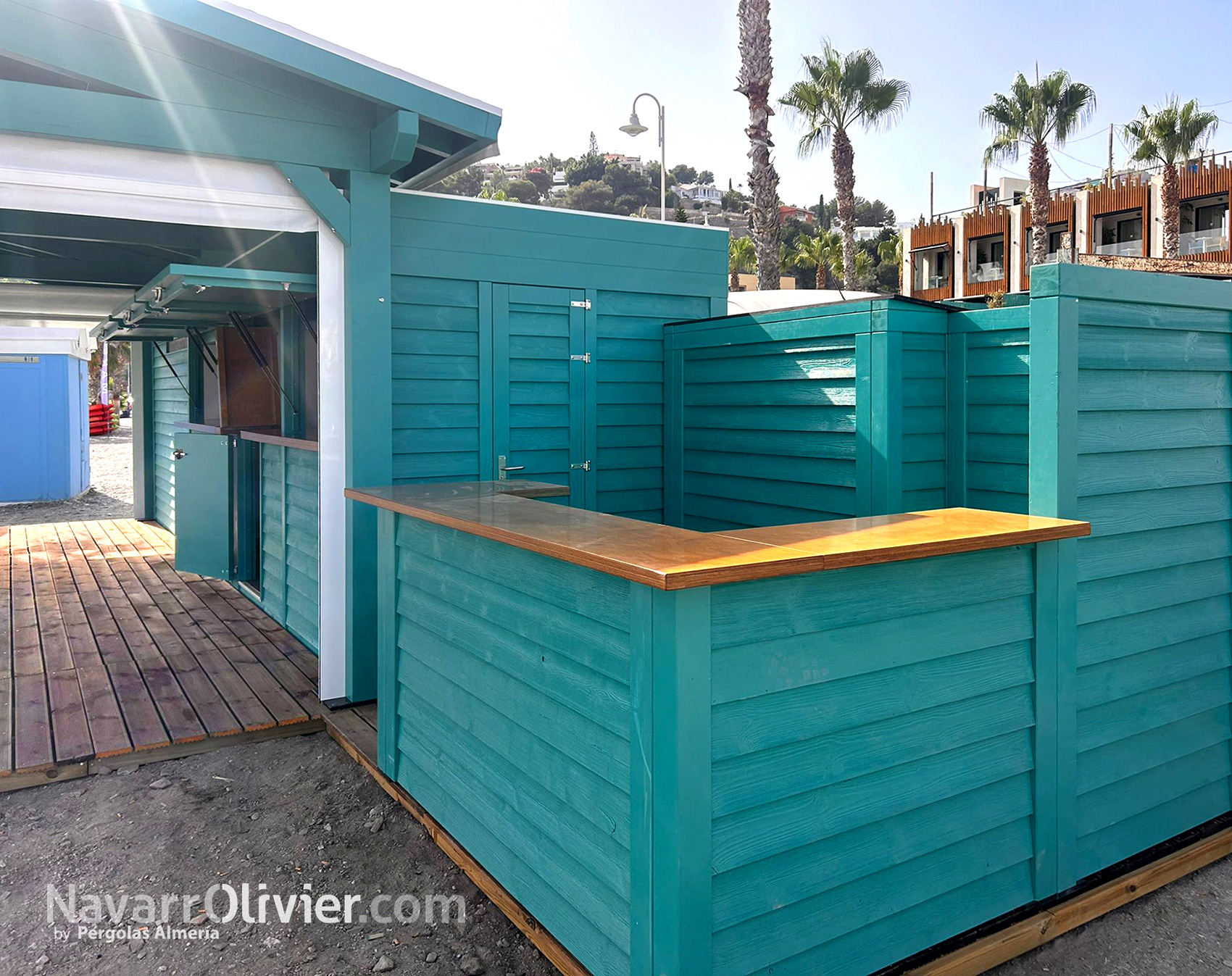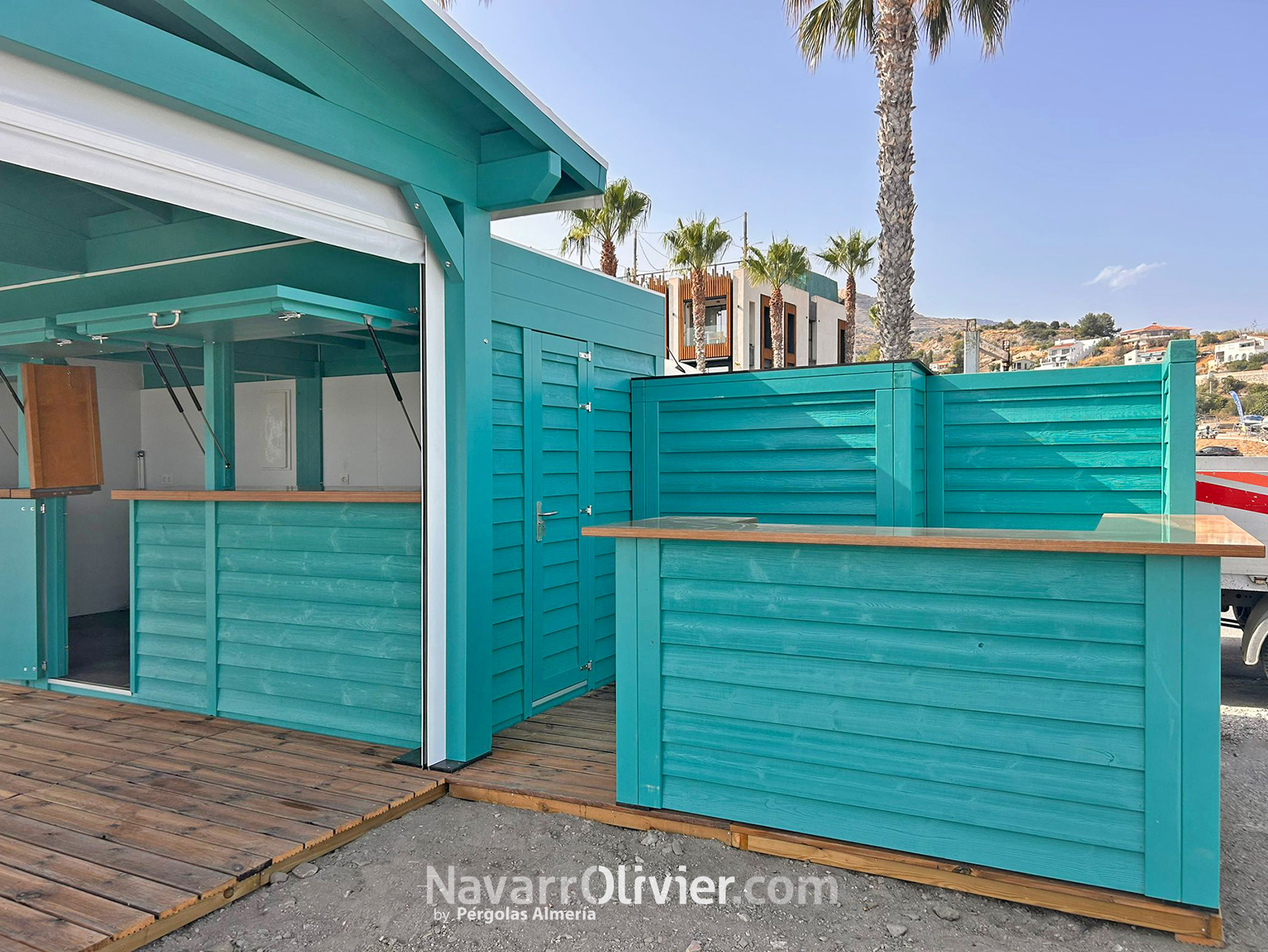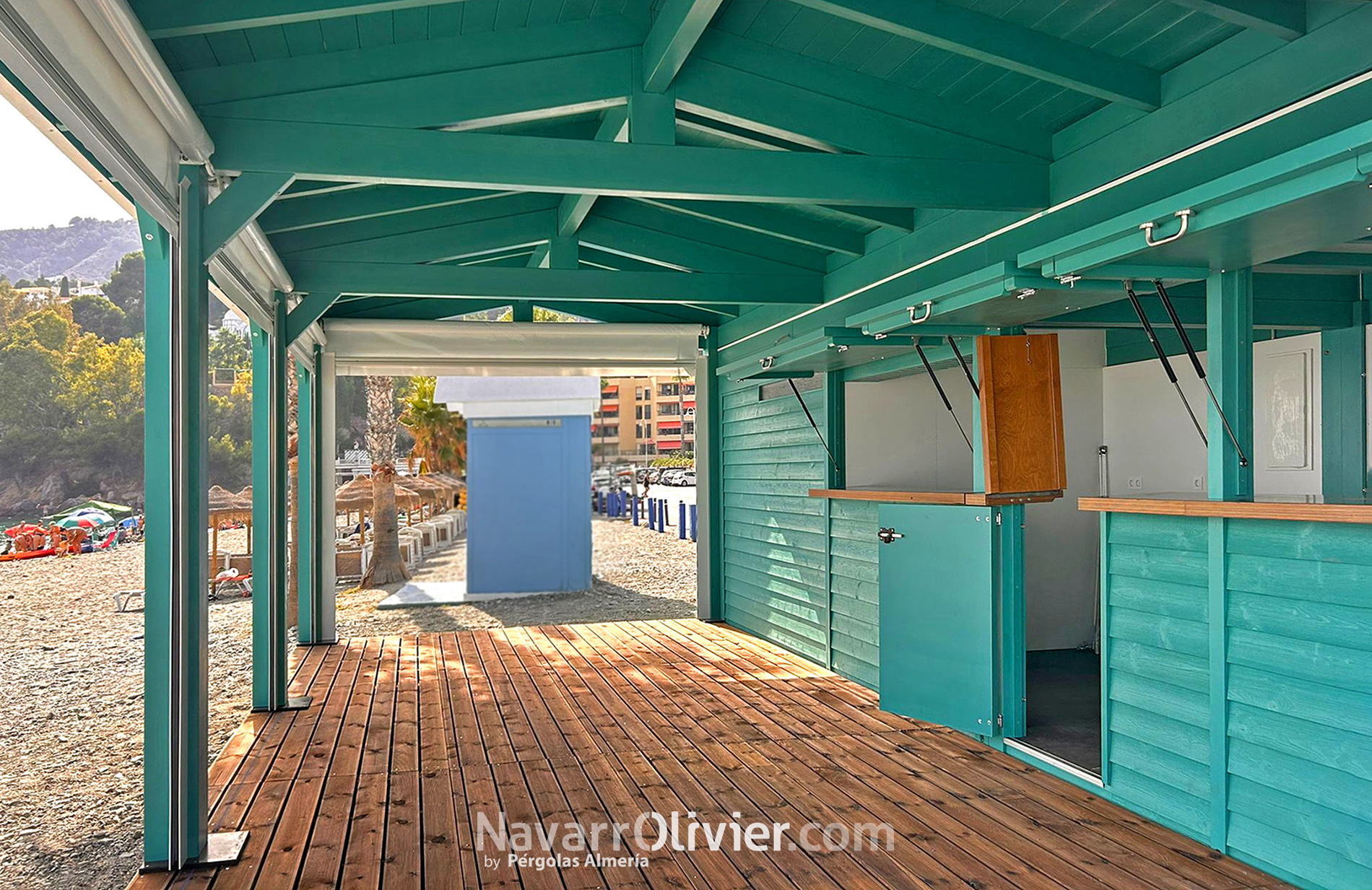 Chiringuito modular de 20 m², con pérgola sobre decck y barra exterior en La Herradura, Almuñecar, Costa Tropical, Granada, Andalucía.