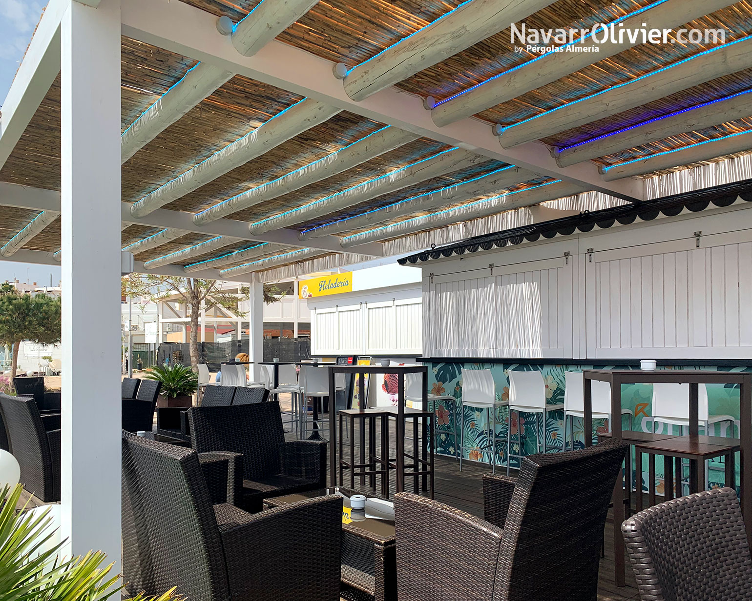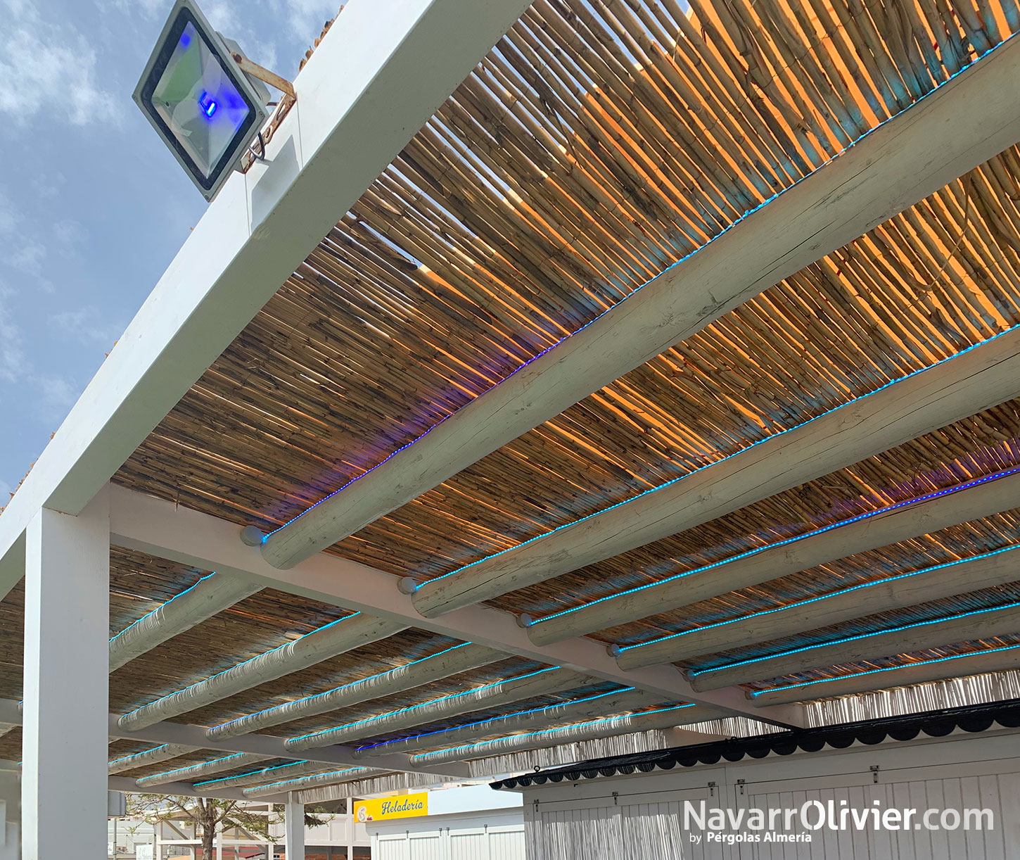 Terraza equipada con pérgola construida en madera lamina y tronco calibrado acabados en blanco, cubierta en cañizo natural equipada con iluminación decorativa en LED rgb con control DMX.
