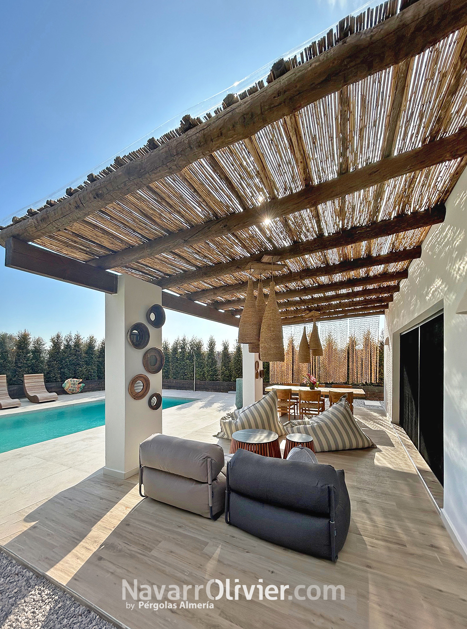 Pérgola adosada natural para jardín con piscina en Nueva Andalucía, Marbella, Málaga.