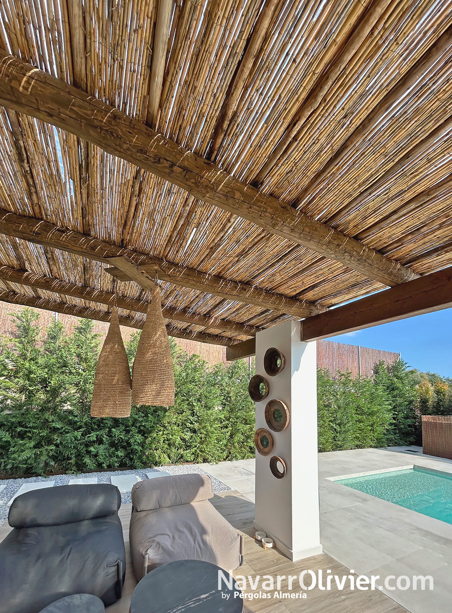 Pérgola de madera, tronco y caña en Nueva Andalucía, Marbella, Málaga.