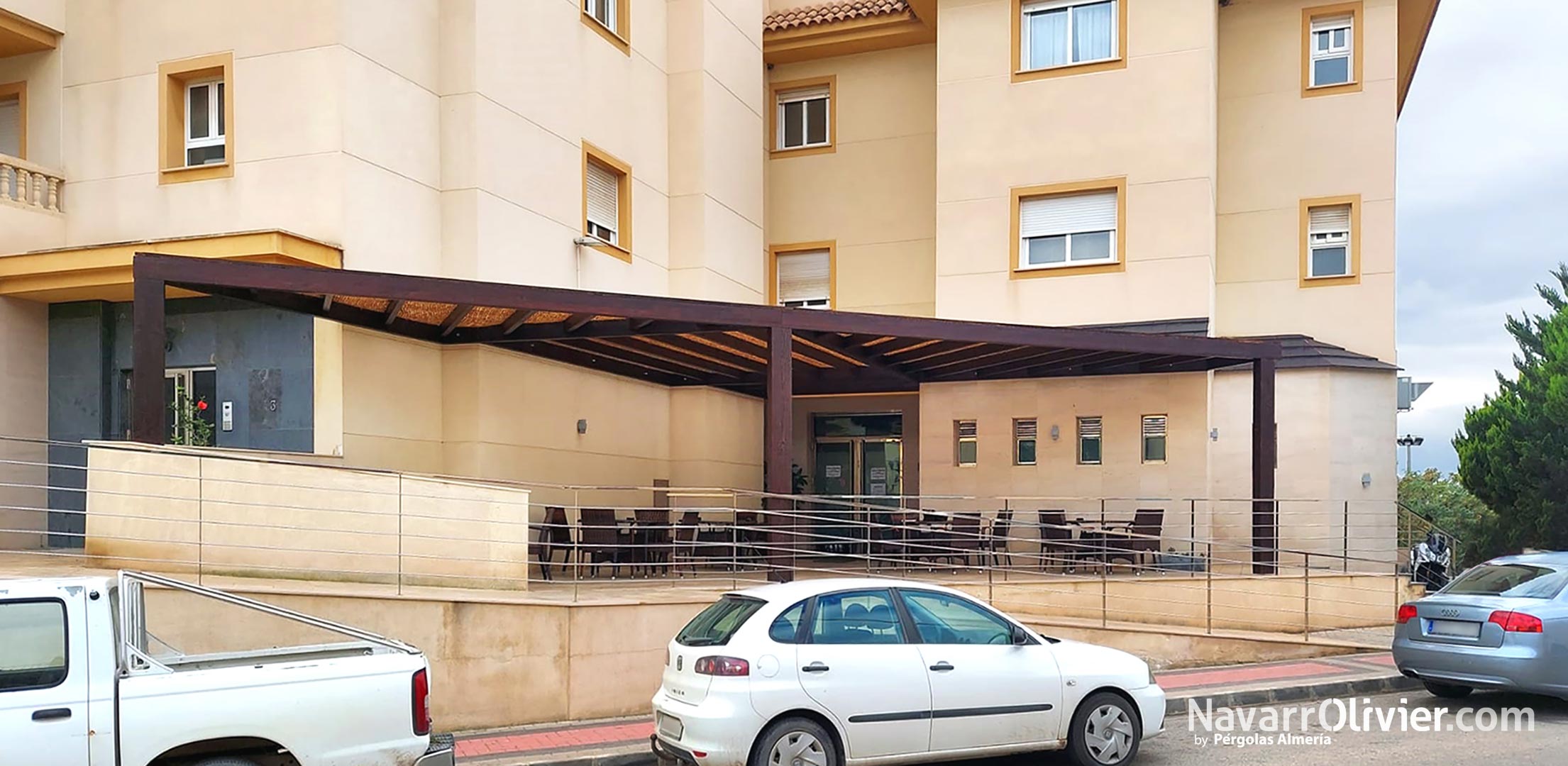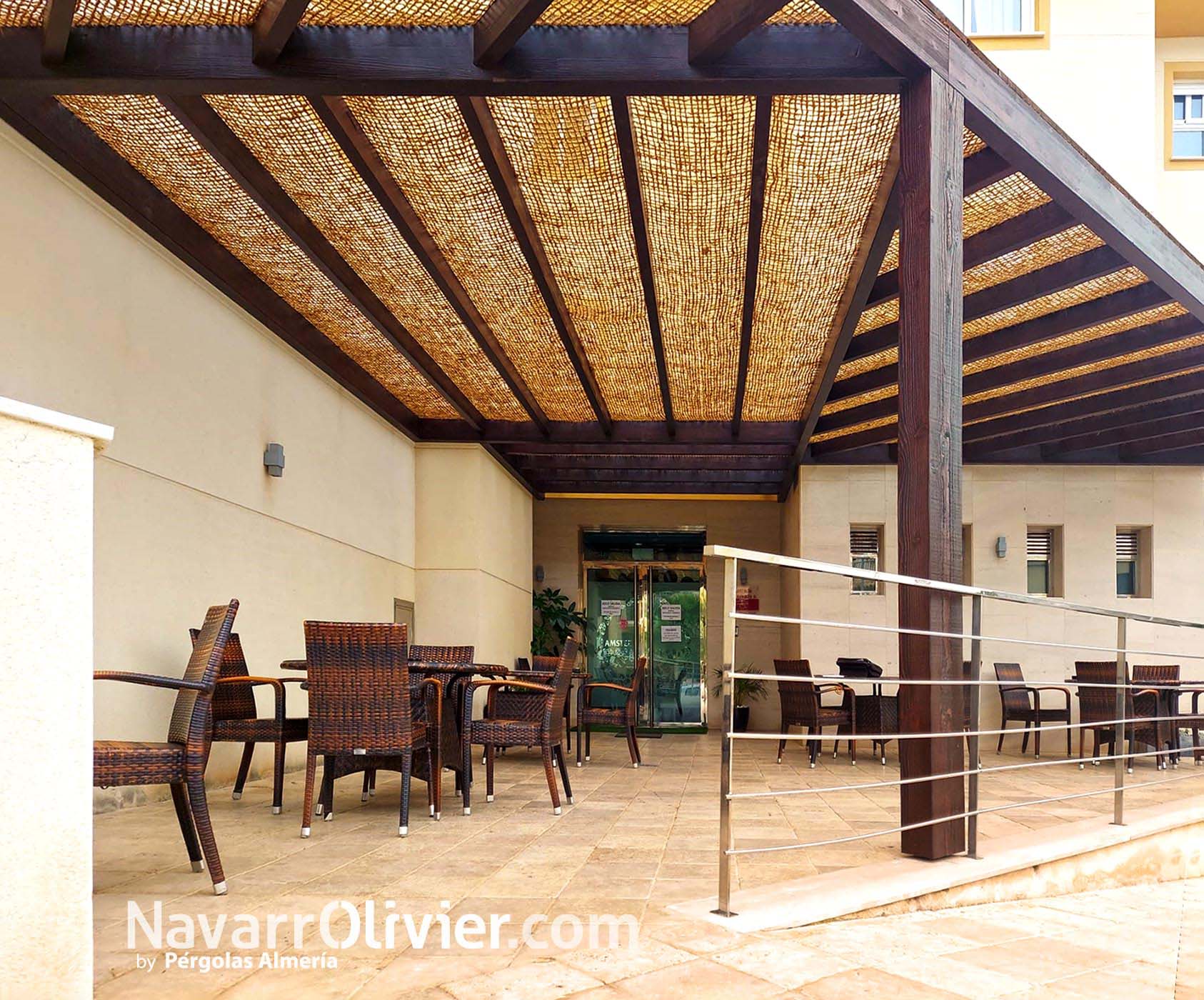Pérgola de madera tratada para exterior para dar sombra a la terraza de la cafetería.