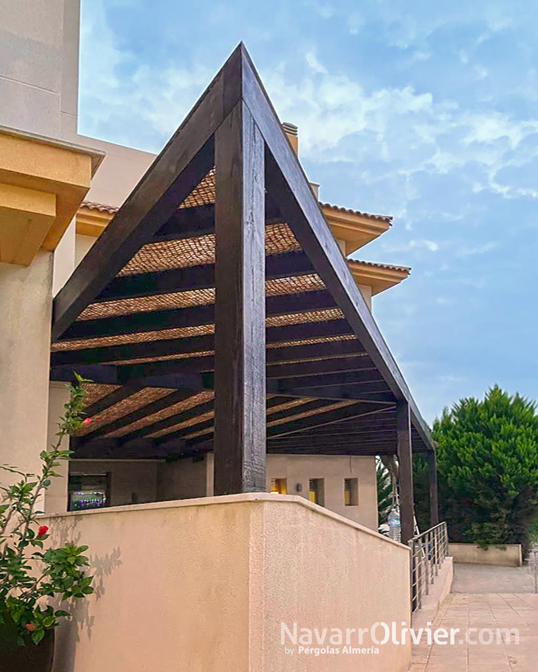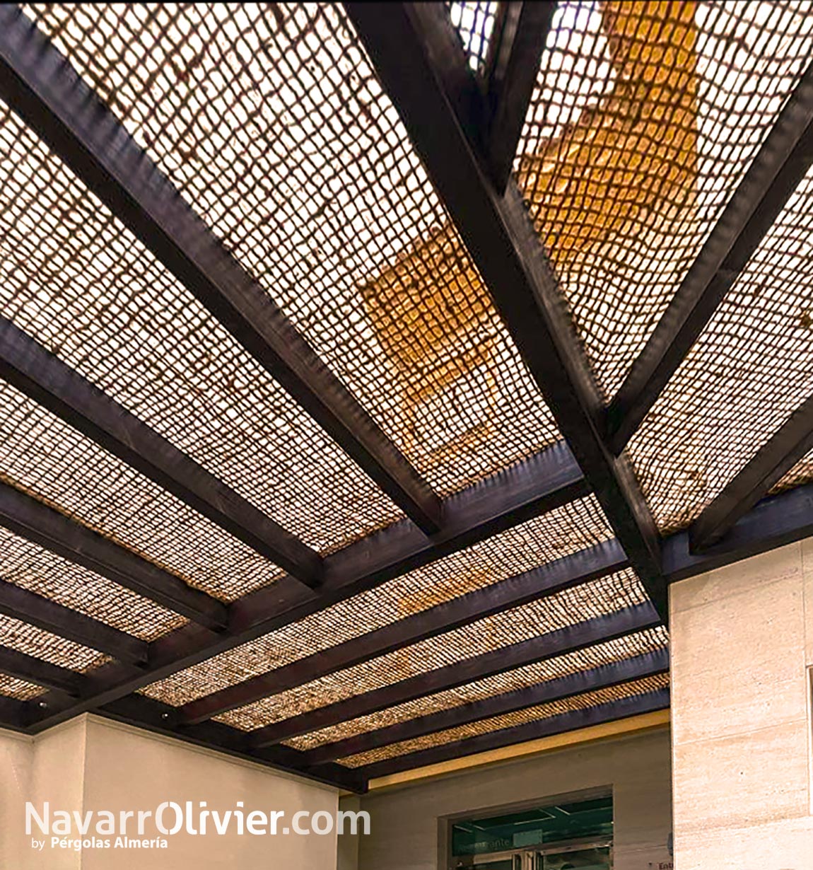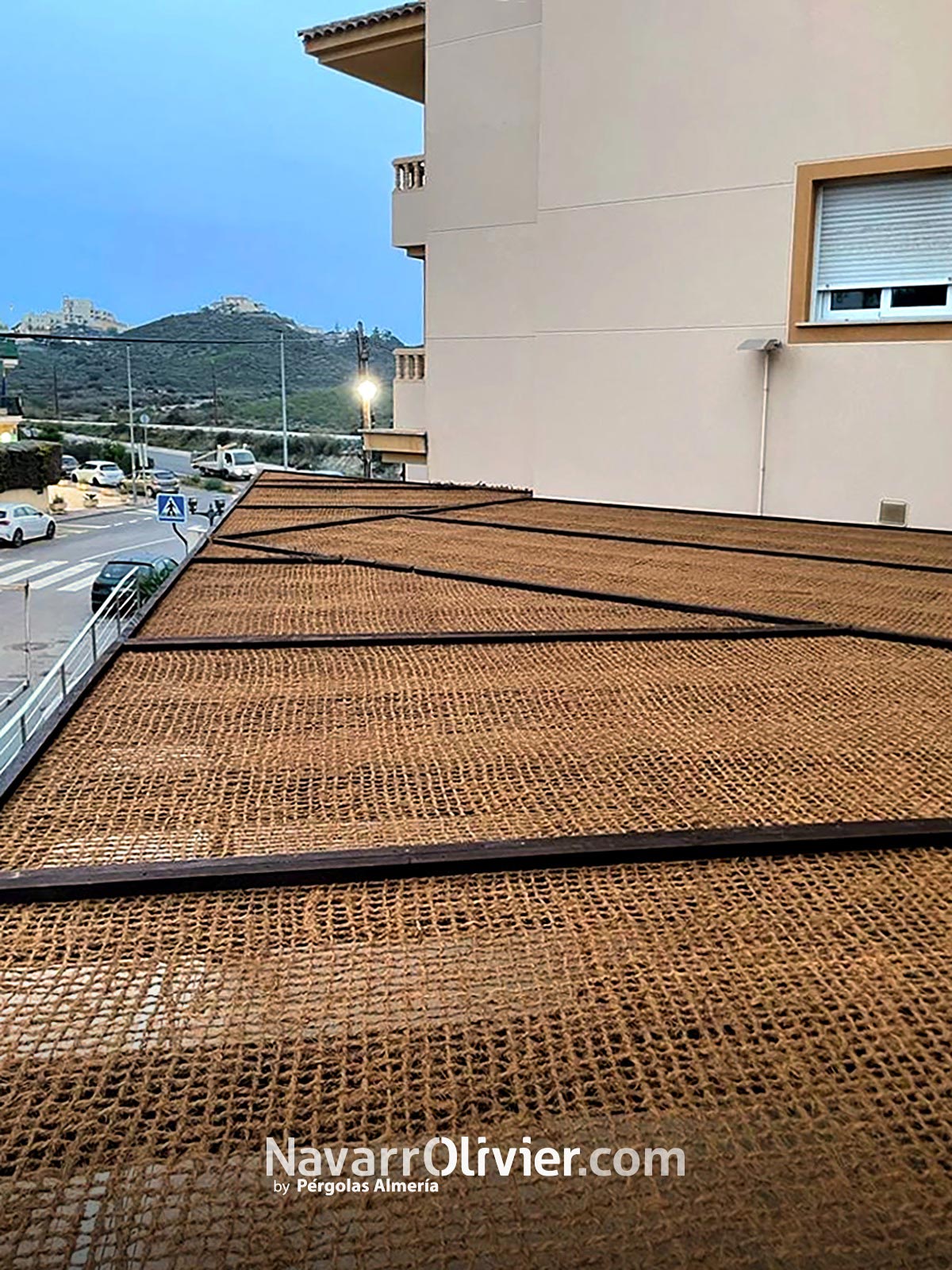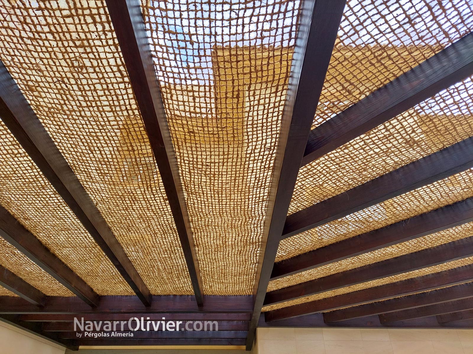 Esta fantástica pérgola adosada de madera con cubierta de red de fibra vegetal se ubica en Águilas, región de Murcia.