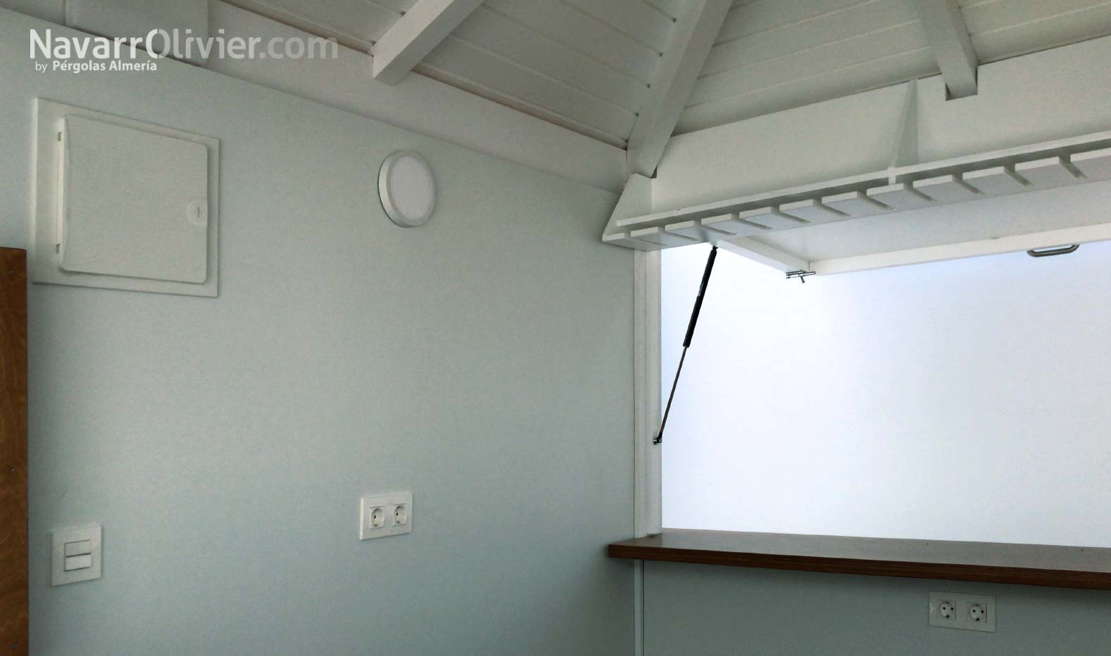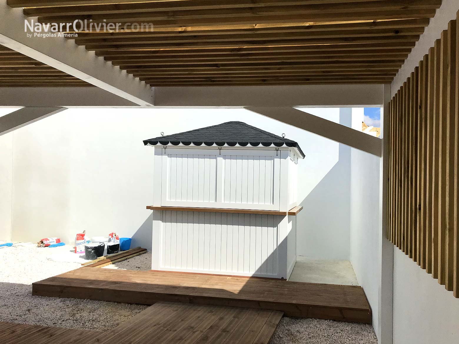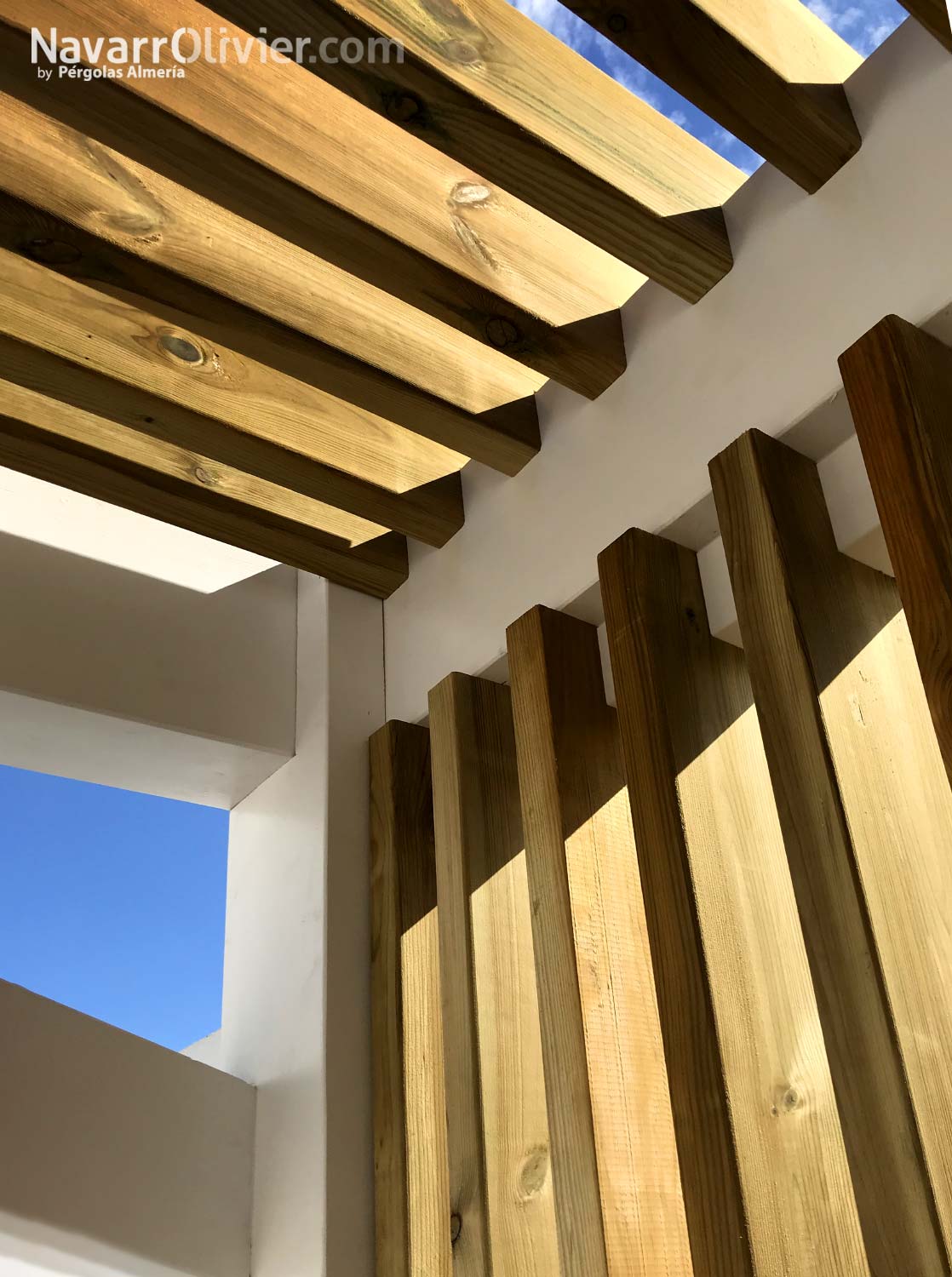 La instalación realizada en una vivienda unifamiliar de Mazarrón cuenta con una pérgola en madera laminada acabada en blanco con una cubierta ventilada en listones paralelos con continuidad hasta el muro que aporta refugio y procacidad, el suelo de la terraza en madera de abeto con ranurado antideslizante tratado en autoclave aporta calidez a la instalación e incluye luces led empotradas.