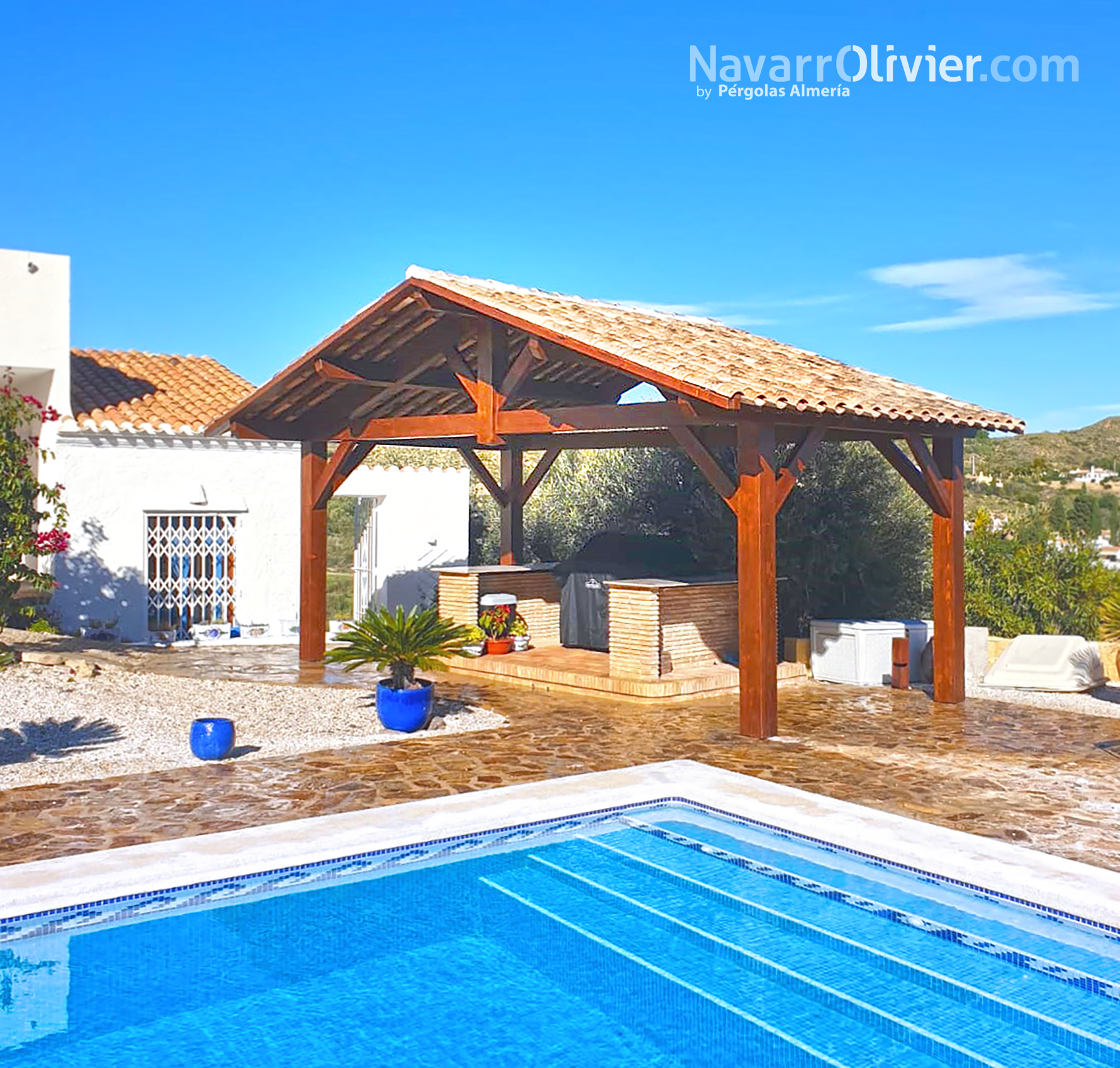Pérgola de madera con cubierta a 2 aguas para cocina exterior de casa rural.