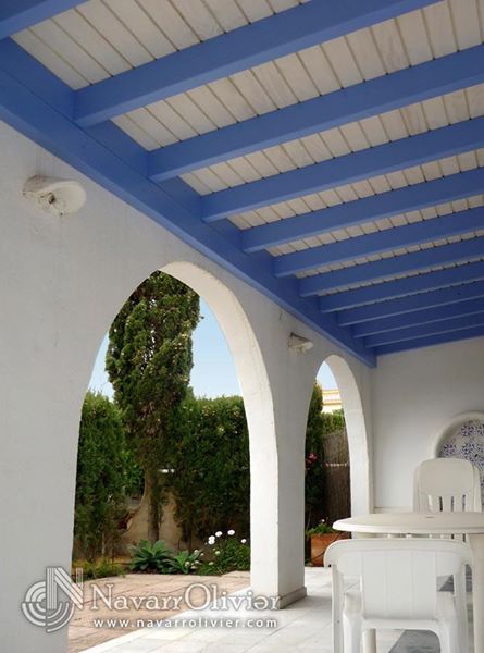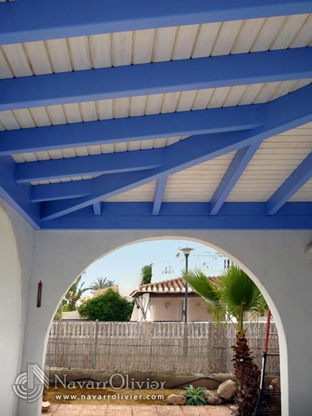Estructura adosada en madera laminada encolada y madera maciza con cubierta en tablero fenólico ranurado. El diseño del porche se integra en la casa de estilo mediterráneo manteniendo la estética y paleta de colores predominantes en la localidad de Mojácar, Almería. La techumbre cubre la zona perimetral de la vivienda dejando espacios donde solo están las correas para permitir el ingreso de la luz hacia las ventanas y permitir la correcta ventilación de la galería.